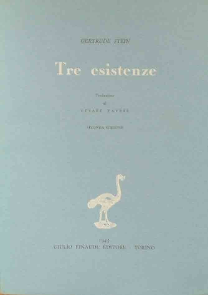 Gertrude Stein, Tre esistenze, traduzione di Cesare Pavese, Giulio Einaudi Editore, Torino 1943, seconda ed., pp. IX, 202, 1 c. di tavv. in antiporta ill. b.n. con ritratto dell’autore applicato, cm 22, br. ed. con sovraccoperta in acetato. Collana Narratori stranieri tradotti, n. 8. Carta uniformemente brunita, per il resto ben conservato.