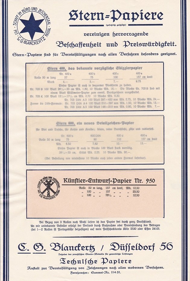 Der historische Firmenprospekt bewarb die sogenannten Stern-Papiere der Firma Blanckertz in Düsseldorf von Unternehmer Carl Gustav Blanckertz. Das Blatt besitzt drei mittig im Blatt montierte Papierproben: Stern 400 / Stern 600 / Künstler-Entwurf-Papier Nr. 950. Alle drei Papierproben sind sehr gut erhalten und zudem mit verschiedenen Maßen und Preisen genauer bezeichnet. Da die Preise in Mark beziffert sind und es sich auch nicht um Inflationspreise handelt, stammt der Werbeprospekt wahrscheinlich aus der Zeit zwischen ca. 1910 - 1920. Seltener und aufwändig gestalteter Prospekt der einstigen Firma Blanckertz aus Düsseldorf!