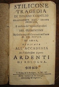 Stilicone. Tragedia. trasportata dall’idioma francese e recitata da’ Signori Cavalieri del Clementino nelle vacanze del Carnevale nell’anno MDCXCVIII in Roma dedicata all’Accademia de l’illustrissimi Signori Ardenti di Bologna