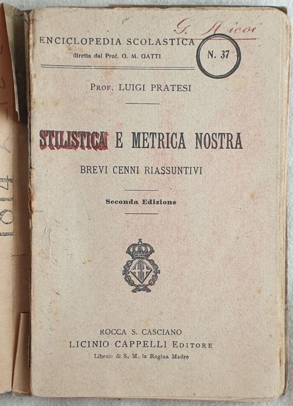Edizione del 1918 di questo manuale di stilistica e metrica scritto da Luigi Pratesi della collana Enciclopedia scolastica n. 37. Note manoscritte e sottolineature all'interno. Firma in copertina. In discrete condizioni. Copertina editoriale in discrete condizioni generali con lievi usure ai margini e dorso. Piatto anteriore assente. Copertina coperta da carta decorata. Legatura in discrete condizioni con qualche lieve rottura. All'interno le pagine si presentano in buone condizioni con bruniture. In 16. Dim. 16x11,5 cm. Pp. 78+(2).Edition of 1918 of this manual of stylistics and metrics by Luigi Pratesi of the series Enciclopedia scolastica n. 37. Handwritten notes and underlinings inside. Signature in the cover. Fair conditions. Editorial cover in fair general conditions slightly worn in the edges and spine. Front plate is missing. Cover is covered by decorated paper. Binding is almost missing. Inside pages are in good conditions with yellowings. In 16. Dim. 16x11,5 cm. Pp. 320.