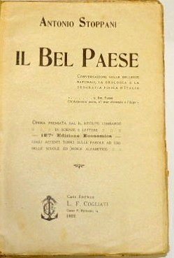 Antonio Stoppani, Il Bel Paese. Conversazioni sulle bellezze naturali, la geologia e la geografia fisica d'Italia. Opera premiata dal R. Istituto Lombardo di Scienze e Lettere. Cogli accenti tonici sulle parole ad uso delle scuole e indice alfabetico. Edizione stereotipa originale, Casa Editrice L. F. Cogliati, s.l. 1922, 127a ed. economica, pp. 662, ill. b.n., cm 20, br. ed. Tracce d'uso e alla brossura con qualche mancanza al dorso, alla copertina anteriore manoscritta a lapis la dicitura "Scienze", uno strappetto ad una carta ma senza mancanze, per il resto esemplare in buono stato di conservazione.