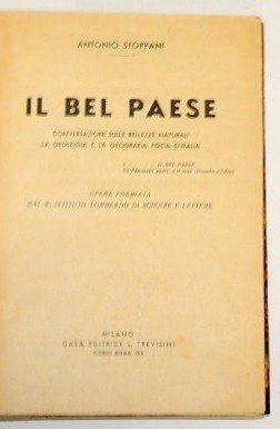 Antonio Stoppani, Il Bel Paese. Conversazioni sulle bellezze naturali, la geologia e la geografia fisica d'Italia. Opera premiata dal R. Istituto Lombardo di Scienze e Lettere, Casa Editrice L. Trevisini, Milano s.d, pp. 531, cm 20, mezza tela. Firma d'appartenenza alla prima pagina di guardia, minime tracce d'uso ai piatti, ma per il resto esemplare in buono stato di conservazione con legatura solida.