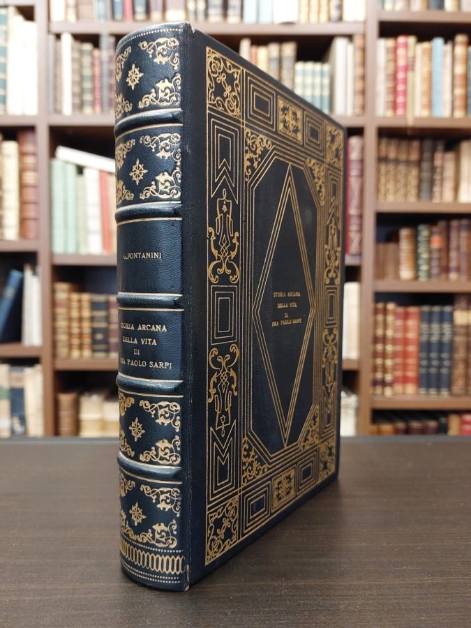In-8° (cm. 21,9), legatura successiva d'amatore in piena pelle blu notte, dorso con titolo ed eleganti fregi in oro tra i comparti dei nervi con filetti sempre in oro, piatti inquadrati da ricche cornici decorate con fregi e motivi geometrici al cui centro un triplice rombo in oro riporta il titolo al piatto anteriore e le iniziali impresse a secco a quello posteriore, unghiatura con fregi sempre in oro, risguardi in carta marmorizzata; pp. XVI 488 [2] in barbe, in stato molto buono (lievi fioriture sparse). Prima edizione; la parte finale raccoglie 123 lettere del Sarpi. Feroce stroncatura del Sarpi. Esemplare molto buono. (NJ7)