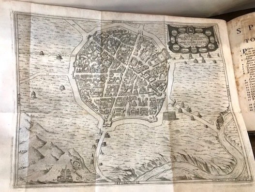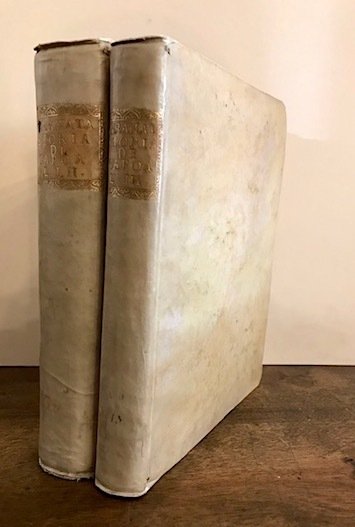 4to (cm. 23), 3 Parti legate in due volumi, 12 cc.nn. (compresa antiporta con ritratto dell’A. inciso da Antonio Baldi), 460 pp., 17 cc.nn.; 8 cc.nn., 351(1) pp., 6 cc.nn. Una illustrazione araldica a p. 124 del primo volume, ripetuta su una tavola f.t. del secondo volume. Con 3 grandi tavv. ripiegate f.t. (’Descrittione della Città di Capua.’, ‘Topographia veteris Capuae’ e ‘Piano della Città e della fortificazione di Capua’). Fregi xilografici n.t. Legature coeve in pergamena rigida con titoli impressi in oro su tassello dipinto al ds. Tagli colorati. Ex libris di collezione privata ai contropiatti anteriori. Antiche scritte di collocazione sulle carte di guardia. Timbretti di bibl. privata (sbiaditi) ai frontespizi. Diffuse fioriture dovute alla qualità della carta. Nel complesso, esemplare in ottimo stato di conservazione. Rara edizione originale. Lozzi, 1065 (in nota); Platneriana, p. 87.