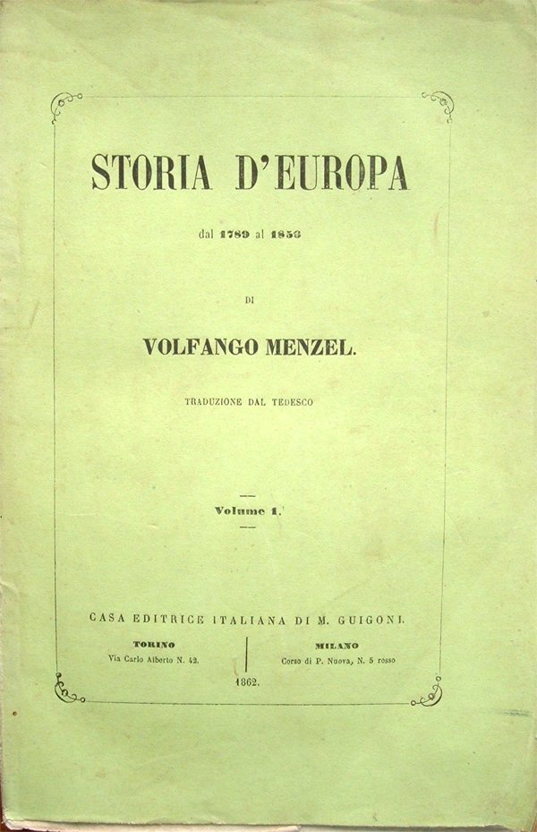 Due volumi in-8° (cm 24,3x15,7), pp. XVI, 363, (1); 412, copertina editoriale con normali tracce d'uso, in particolare ai dorsi. Qualche piccolo segno d'umido, per il resto esemplare molto ben conservato, in barbe editoriali. Volumi in edizione originale. Opera non comune. Le copertine dei volumi, usciti in anni differenti, sono del medesimo colore ma nell'impaginazione dei titoli, ai dorsi, presentano caratteristiche differenti. Indice: Volume I. Prefazione; Libro Primo. L'Europa prima della Rivoluzione francese; Libro Secondo. Principii della Rivoluzione francese; Libro Terzo. Caduta della monarchia francese; Libro Quarto. Periodo del Terrore durante la Convenzione; Libro Quinto. Caduta di Robespierre. Cessazione del Terrore; Libro Sesto. Spedizione di Buonaparte in Italia; Libro Settimo. Congresso di Rastadt. Spogliazioni della Svizzera; Libro Ottavo. Suwarow in Italia; Libro Nono. Bonaparte in Egitto; Libro Decimo. Il 18 Brumale e battaglia di Marengo; Libro Undecimo. Il Primo Console e la pace; Libro Duodecimo. Fondazione dell'Impero francese. Volume II. Libro Decimoterzo. Caduta dell'Impero germanico; Libro Decimoquarto. Umiliazione della Prussia; Libro Decimoquinto. Congresso di Erfurt; Libro Decimosesto. Sollevazione popolare in Ispagna; Libro Decimosettimo. Ultima riscossa dell'Austria; Libro Decimottavo. Il Re di Roma; Libro Decimonono. Wellington in Ispagna; Libro Vigesimo. Il verno del 1812 in Russia; Libro Vigesimoprimo. La Prussia nel 1813; Libro Vigesimosecondo. Battaglia di Lipsia; Libro Vigesimoterzo. Caduta di Napoleone; Libro Vigesimoquarto. Riordinamento dell'Europa nel 1815.