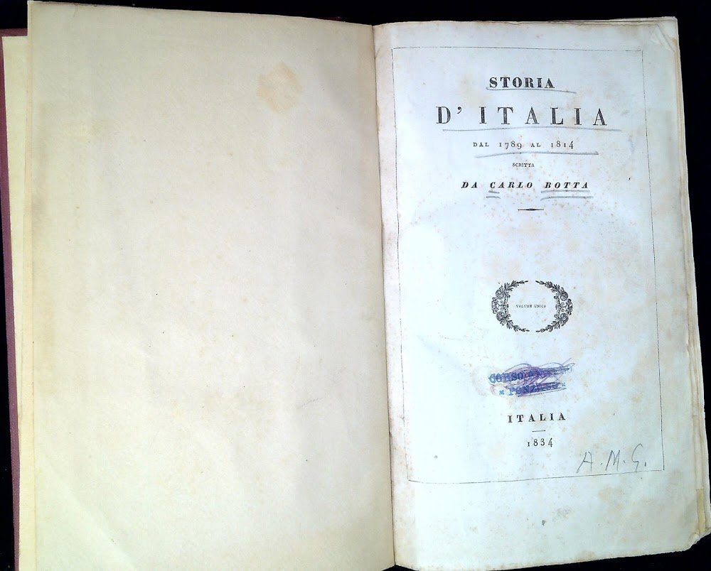 Botta, Carlo Storia d'Italia dal 1789 al 1814. Italia, senza indicazione editoriale 1834, 593 p. ; 25 cm (63713)