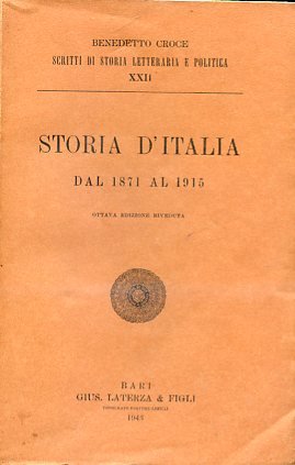 In-8°, pp. VIII, 360, (2), brossura originale color mattone. Una firma all'occhietto. Ottimo stato. Ottava edizione riveduta (la prima è del 1928) di questa classica opera storiografica crociana in cui l'esaltazione, talora sfociante in una nostalgica oleografia, dell'età umbertina della giovinezza di Croce, è contrapposta in implicita polemica alla rozzezza del regime fascista. Presentando l'opera Croce la definì lo 'schizzo di una storia dellItalia dopo la conseguita unità di stato', concepito come «tentativo di esporre gli avvenimenti nel loro nesso oggettivo e riportandoli alle loro fonti interiori'. Cfr. (prima edizione): Nicolini, L'editio ne varietur delle opere di Benedetto Croce, 75. Borsari, L'Opera di Benedetto Croce, 2044.