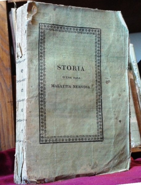 Volume in 8, brossura morbida editoriale (mende e mancanze), titolo entro cornice silografica al piatto, occhiello, frontespizio (timbro di biblioteca dismessa), dedicatoria, prefazione, XII, 297 pp., carta di errata. Esatta e puntigliosa presentazione dei fenomeni morbosi di una particolare malattia nervosa, seguiti ora per ora, durante tutta la durata della cura (da aprile ad ottobre del 1816), con un accurata descrizione delle composizioni medicamentose, bevande e cibi somministrati; ma anche un interessante uso terapeutico della musica strumentale e del dialogo. Molto interessanti le Note a conclusione del volume, che oltre ad essere un ottima bibliografia sullargomento, riassumono importanti nozioni mediche, psicologiche e filosofiche riguardanti le malattie nervose, dallantichit allepoca dello scritto. Di notevole importanza inoltre, linedito apporto scientifico sulluso del Lythrum Salicaria (largamente utilizzata in Europa durante la prima guerra mondiale nella terapia della febbre da tifo), con dettagliati saggi analitici effettuati appositamente e per la prima volta, su richiesta del Dottor Ricotti da Dottor Francesco Barenghi, di cui vengono trascritte le analisi chimiche con i risultati e la determinazione dei materiali rinvenuti, oltrech le osservazioni personali dellautore (trattazione guidata dalle osservazioni fatte nello spazio di 5 anni su diversi casi di tifo, del giovamento dalla somministrazione di foglie o radici di questa pianta, nelle affezioni catarrali ed altri molesti mali nervosi). Stampato a grandi margini su carta forte, sporadiche fioriture dovute al tipo di carta. In barbe. Raro ed interessante.