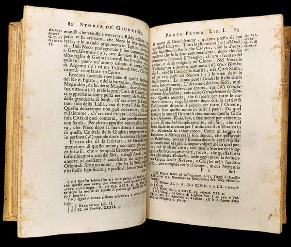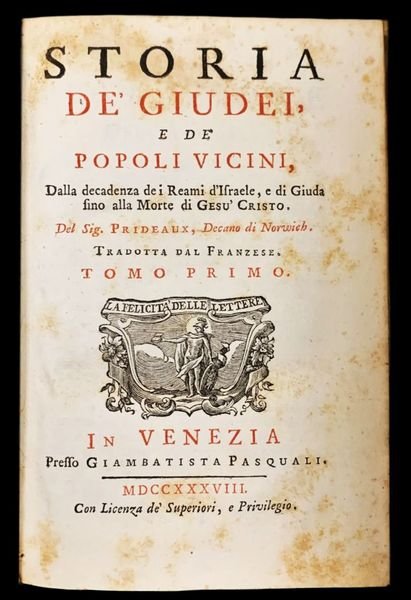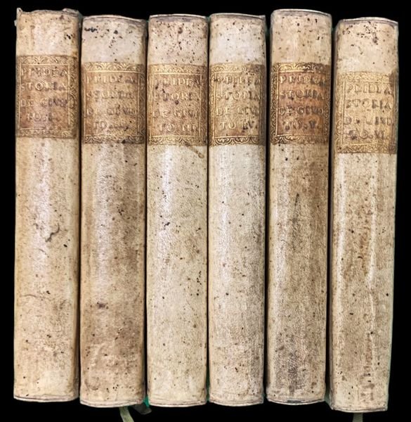 In 8° (17x11,1 cm); sei tomi: XLVIII, 293, (3) pp. e 9 c. di tav. fuori testo, alcune più volte ripiegate (un piccolo strappo senza perdita di testa ad una delle tavole anticamente restaurato); (4), 375, (3) pp. e due c. di tav. fuori testo più volte ripiegate (uno strappetto senza perdita di carta ad una delle tavole; (4), 370 pp. e una grande c. di tav. più volte ripiegata; (4), 363, (3) pp. e una grande c. di tav. più volte ripiegata; (4), 368 pp. e una grande c. di tav. più volte ripiegata; (4), 241, (1 b.), LXVII, 68-154, (2) pp. e una grande c. di tav. più volte ripiegata. Legature omogenee in piena pergamena molle con titolo e numero del volume impressi in oro al dorso. Tagli spruzzati. Qualche pagina con minimo foxing dovuto alla qualità della carta ma nel complesso esemplare in buone-ottime condizioni di conservazione. Le tavole si dividono in carte geografiche realizzate da F. Polanzani (Palestina, Grecia, Turchia, Penisola arabica, Persia, India, Africa del Nord, ecc.) e 7 tavole di costumi e monumenti (pianta del Tempio fìdi Gerusalemme, pianta di Babilonia, tabernacolo, candeliere d'oro, ecc.). Prima edizione non comune da reperire completa ed in legatura coeva di questa importante opera storica che ricostruisce la storia e le usanze del popolo ebreo scritta dal noto teologo ed ebraista inglese, Humphrey Prideaux (Padstow, 3 maggio 1648 Norwich, 1º novembre 1724), riconosciuto come lautore del primo trattato di storia ebraica intertestamentale a connettere l'Antico con il Nuovo Testamento. Lautore studiò prima a Liskeard e poi a Bodmin, per poi trasferirsi alla Westminster School e quindi al Christ Church College a Oxford. Qui conseguì il titolo di studio e vi lavorò, poi, dal 1679 come istruttore debraico e bibliotecario. Nel 1686 lasciò Oxford per Norwich dove aveva ottenuto lincarico di canonico della cattedrale: Nel 1702 fu insignito della carica di decano e partecipò attivamente alla vita politica della città. A lui si deve anche una delle prime vite di Maometto ad apparire in occidente, pubblicata nel 1697. Lopera qui presentata, considerata il suo capolavoro, fu elaborata fra il 1716 ed il 1718, anche se raccoglie appunti raccolti anche negli anni precedenti. A lui si deve la creazione della categoria di giudaismo intertestamentario a definire il periodo del Secondo Temple come il periodo di connessione tra l'Antico e il Nuovo Testamento ed il suo lavoro fu considerato per oltre cento anni, la più esaustiva storia dellebraismo, pubblicata non da un ebreo. Lautore attinse notizie da James Ussher ed il lavoro, fu tra le prime opere inglesi ad usare il termine Vulgar Era, sebbene Keplero usasse il termine già nel 1635. Lo studio portò, anche ad una controversia tra Prideaux e suo cugino, Walter Moyle. Jean Le Clerc ne scrisse un esame critico, che fu pubblicato in inglese nel 1722. Lopera rimane ancora oggi unimportante fonte per la storia del popolo ebraico. Prima edizione italiana, completa. Rif. Bibl.: ICCU IT\ICCU\TO0E\074669 variante B del quinto volume del V volume); Brunet IV, 872 (cita una traduz. francese del 1728 ma si riferisce palesemente a questa edizione).