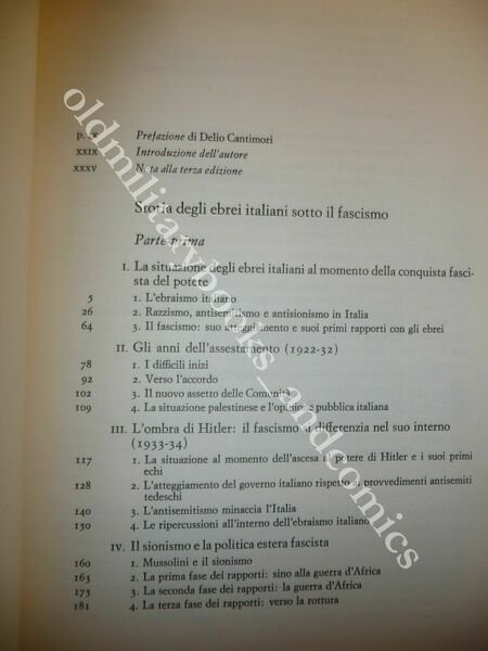 DESCRIZIONE: Einaudi Torino 1972 II^ Ed., br. ed. ca. con sovracc. ill. con alette, pp. 628 in 8°. La persecuzione antisemita scatenata nel 1938 da Mussolini è stata una delle tappe più significative della storia del fascismo: con essa il regime divorziò pubblicamente dal popolo italiano, dalla sua mentalità e dalla sua storia. Renzo De Felice si è proposto di indagare con questo volume l'intima natura dei rapporti tra ebraismo e fascismo vagliando con scrupolo scientifico documenti d'archivio, testimonianze, lettere e carteggi. La più dettagliata ed approfondita analisi della storia degli ebrei italiani durante il Fascismo esaminata nelle sue farie fasi dall'inizio sino alla RSI. Importante e vasta appendice documentale. CONDIZIONI: Ottime sovracc. un po stamca al retro. PESO / WEIGHT: 1000 gr. without package