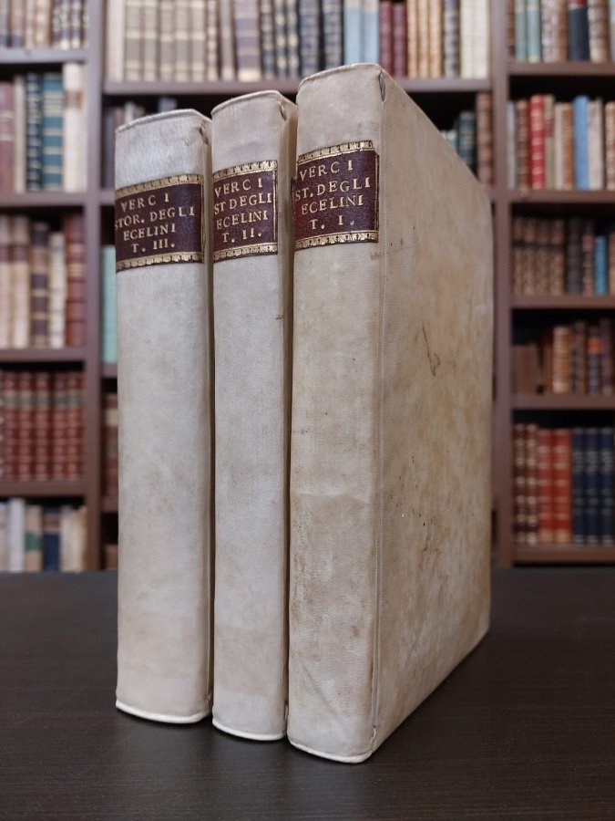 <span style="font-style: normal;">3 volumi in-8° (cm. 19,8), legatura coeva in piena pergamena con titolo in oro su tasselli, squisiti tagli marmorizzati; pp. [6] XLVI 408, 416, XXIV 618 [2] in ottimo stato, con 1 tavola illustrativa f.t. al primo volume (p. 190) raffigurante lo stemma degli Ezzelini «da nessun bibliografo, che io sappia, avvertito» [Lozzi 5610]; frontespizi inquadrati in cornice; vignetta in rame in testa alla dedicatoria indirizzata al Conte Carlo di Firmian. Edizione originale con il terzo volume che contiene il&nbsp;</span><i>Codice Diplomatico Eceliniano</i>. Di grande interesse per gli studi sulla terraferma veneta. Ottimo esemplare. (SH5)