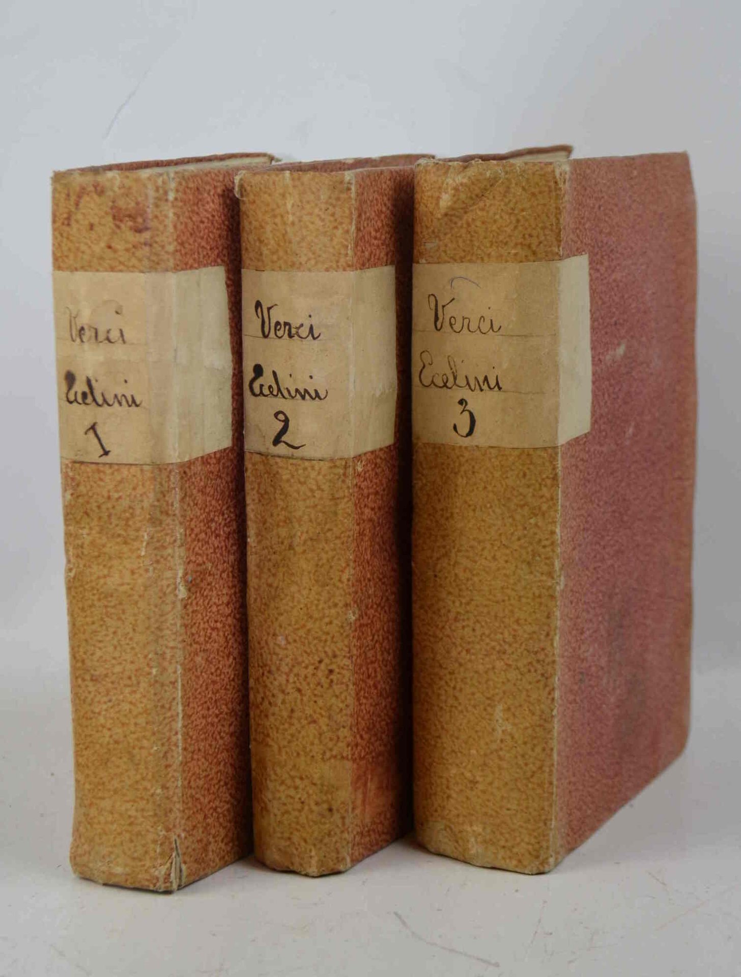 Tre volumi di cm. 20,5, pp. (8) xlvi, 408; 416; xxiv, 618 (2). Frontespizi inquadrati da cornice xilografica, una bella testata alla dedica ed una tavola incisa in rame fuori testo posta tra le pp. 190 e 191 del primo volume e raffigurante lo stemma degli Ecelini. Graziosa legatura strettamente coeva in cart. rigido ricoperto da carta dipinta e con titoli manoscrtti su etichette ai dorsi. Esemplare fresco, marginoso, ed in ottimo stato di conservazione. Ex libris nobiliare a ciascun volume. Edizione originale di questa classica opera storica di grande interesse per il territorio veneto. Non comune. Cfr. Lozzi 5610.