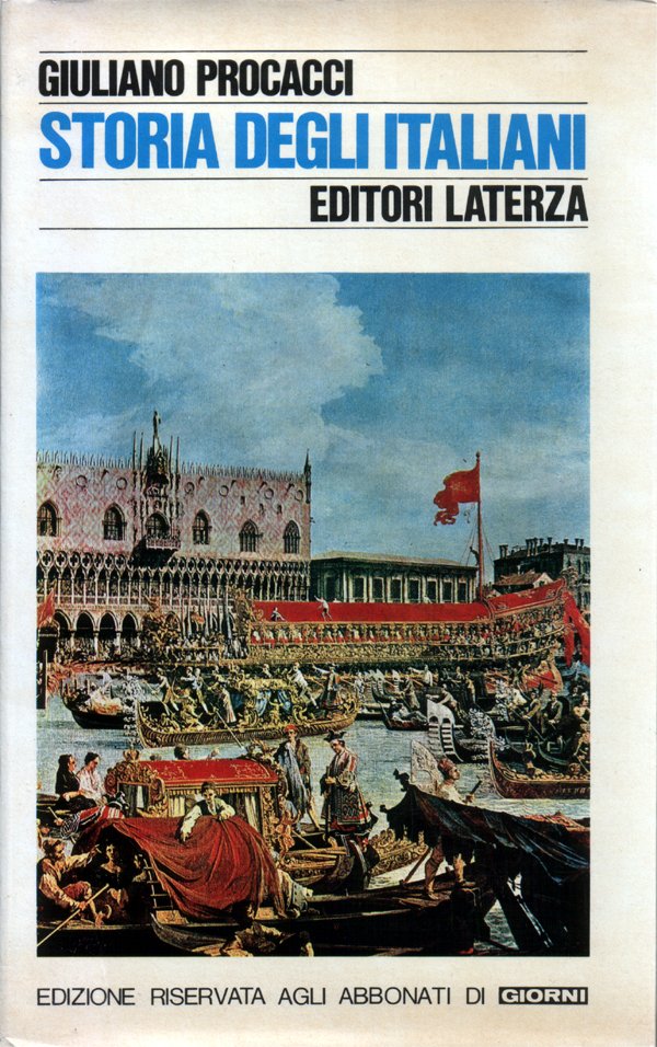 In-8°, pp. XXX, (2), 580, (12), legatura editoriale con sovraccoperta illustrata a colori. Con trentadue illustrazioni fuori testo, sedici a colori e sedici in bianco e nero. In ottimo stato di conservazione. Edizione riservata agli abbonati di "Giorni". Indice: Prefazione di "Giorni"; I mille anni prima del Mille; Introduzione di Giuliano Procacci. Parte prima. I. Intorno all'anno Mille; II. La civiltà comunale; III. Crisi e vitalità di un'età di transizione; IV. 1450-1550. Grandezza e decadenza; V. 1550-1600. Decadenza e grandezza; VI. Un secolo di stagnazione. Parte seconda. I. L'Italia e i lumi; II. L'età delle riforme; III. La Rivoluzione francese e l'Italia; IV. Restaurazione e Romanticismo; V. Le sconfitte del Risorgimento; VI. Le vittorie del Risorgimento; VII. Un decollo difficile; VIII. Origini e caratteri del capitalismo italiano; IX. La crisi di fine secolo; X. La belle époque dura quindici anni; XI. Dalla guerra al fascismo; XII. Dal fascismo alla guerra; XIII. Gli ultimi decenni. Indice dei nomi.