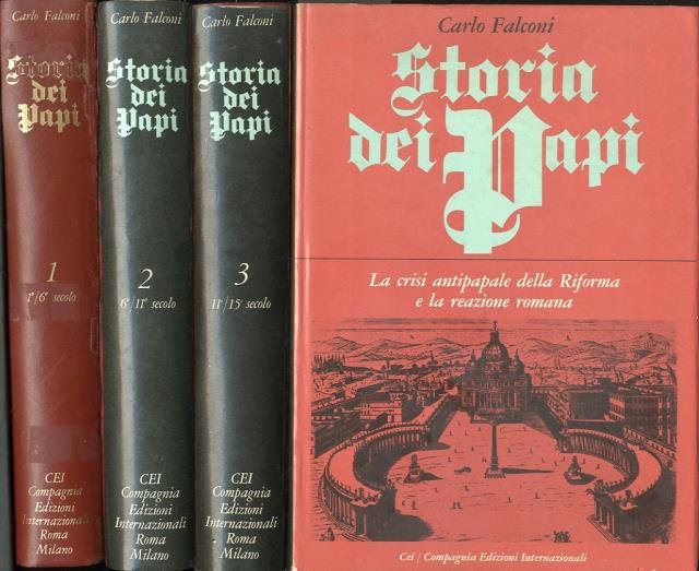 4 v. (XV, 743; 778; 734; 819 p.) : ill. ; 30 x 21 cm. Titoli dei volumi: 1. La nascita del papato nel declino dell'impero; 2. I papi dei secoli di ferro scelgono l'occidente (Il grande scisma con Bisanzio); 3. I Papi e il mito della cristianità nel Medioevo; 4. La crisi antipapale della Riforma e la reazione romana. Opera edita negli anni 1967-1972. Legatura editoriale, coperta in cartone rigido telato, dorso in similpelle di coloro rosso scuro. Sovraccoperta illustrata a colori in carta patinata lucida. All'interno di ogni singolo volume numerose illustrazioni in b/n e a colori. Qualche segno del tempo ai volumi, leggero ingiallimento dei risvolti della copertina, il primo volume non ha la sovraccoperta e mostra una lacerazione ai profili del dorso. Pagine interne dei singoli volumi integre, esemplare da studio. Codice libreria 6022.