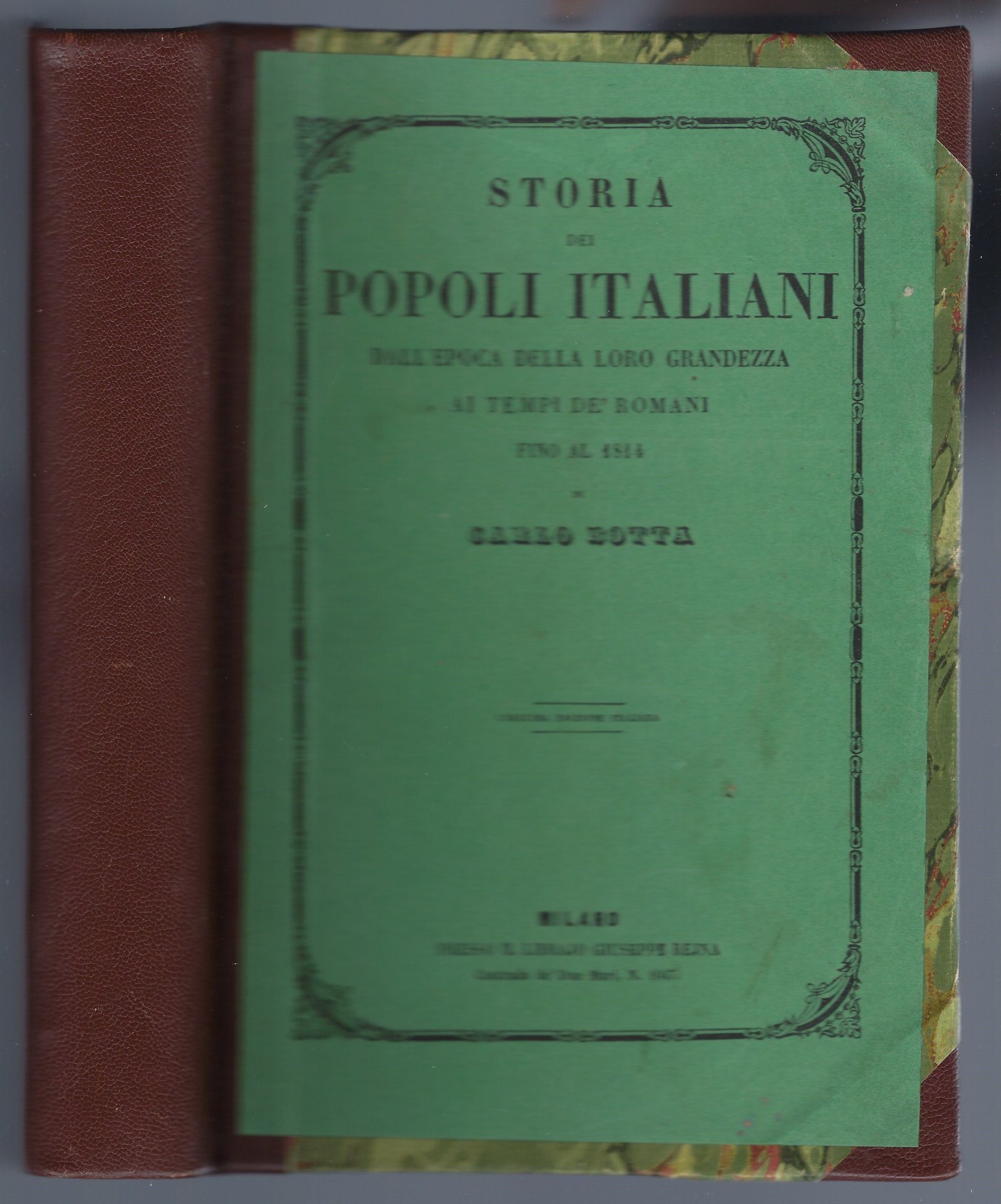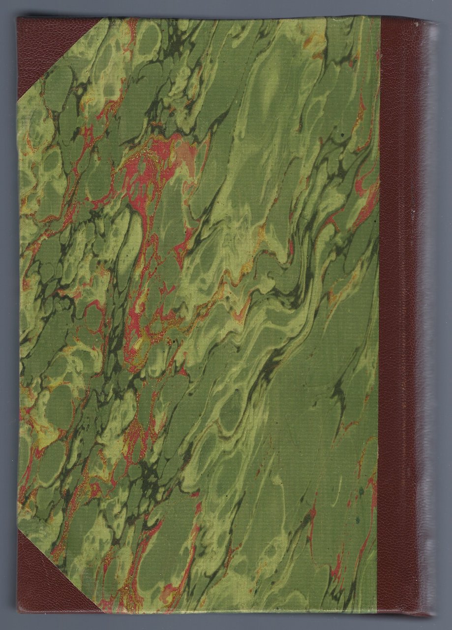 Cartonato editoriale marmorato, con titoli, su sfondo verde, al piatto anteriore e con il dorso e gli angoli in pelle.