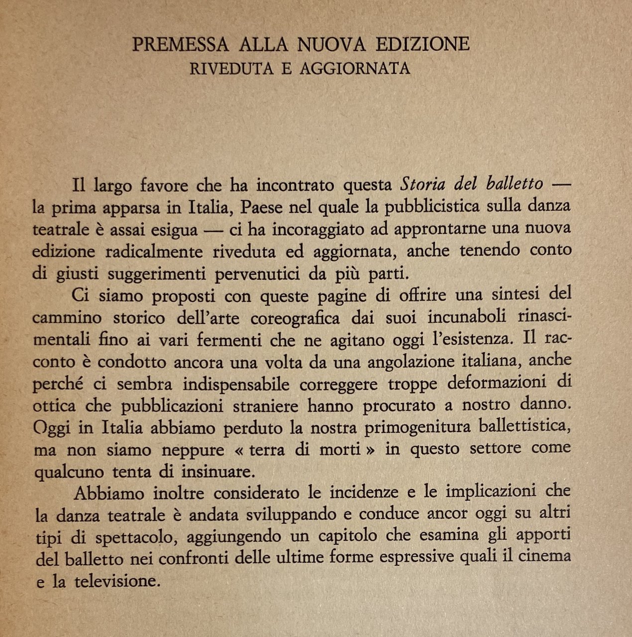 Il largo favore che ha incontrato questa Storia del balletto la prima apparsa in Italia, Paese nel quale la pubblicistica sulla danza teatrale è assai esigua, ci ha incoraggiato ad approntarne una nuova edizione radicalmente riveduta ed aggiornata, anche tenendo conto di giusti suggerimenti pervenutici da più parti. Ci siamo proposti con queste pagine di offrire una sintesi del cammino storico dell'arte coreografica dai suoi incunaboli rinascimentali fino ai vari fermenti che ne agitano oggi l'esistenza. Il racconto è condotto ancora una volta da una angolazione italiana, anche perché ci sembra indispensabile correggere troppe deformazioni di ottica che pubblicazioni straniere hanno procurato a nostro danno. Oggi in Italia abbiamo perduto la nostra primogenitura ballettistica, ma non siamo neppure terra di morti in questo settore come qualcuno tenta di insinuare. Abbiamo inoltre considerato le incidenze e le implicazioni che la danza teatrale è andata sviluppando e conduce ancor oggi su altri tipi di spettacolo, aggiungendo un capitolo che esamina gli apporti del balletto nei confronti delle ultime forme espressive quali il cinema e la televisione.