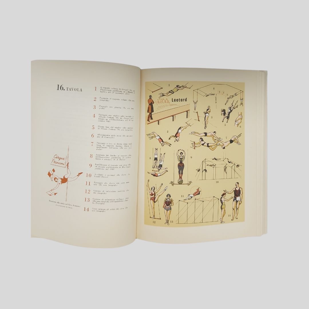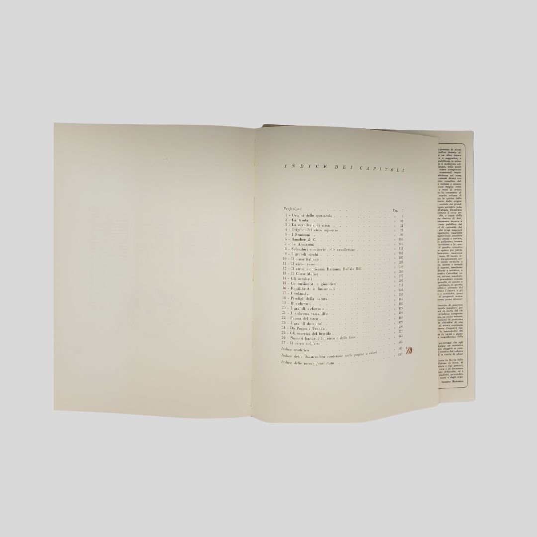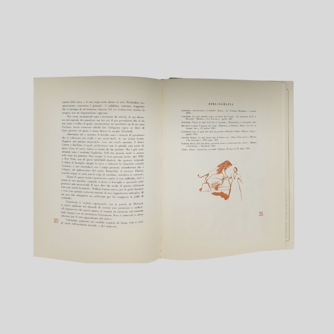 In-4° picc. (cm 28,5), pp. 589. Elegante edizione con numer. vignette in sanguigna interc., 20 tavv. in tinta f.t. che documentano scene della vita del circo e 24 tavv. a colori f.t. contenenti oltre 300 illustrazioni (sistemi e metodi di esecuzione di spettacoli e di singoli numeri). Legatura editoriale in tutta tela, tit. in rosso al dorso e ai piatti, impressioni in oro ai piatti. Sopracoperta. In ottimo stato di conservazione. Come nuovo. Importante monografia sul mondo del circo riccamente illustrata: il circo equestre, le cavallerizze, i circhi italiani, russi, americani, francesi, etc., Barnum, Buffalo Bill, il Circo Molier, gli acrobati, i giocolieri, i contorsionisti, equilibristi e funamboli, i clowns, i grandi domatori, gli animali nel circo, il circo nell’arte… Ogni capitolo con una propria bibliografia. Indici in fine.