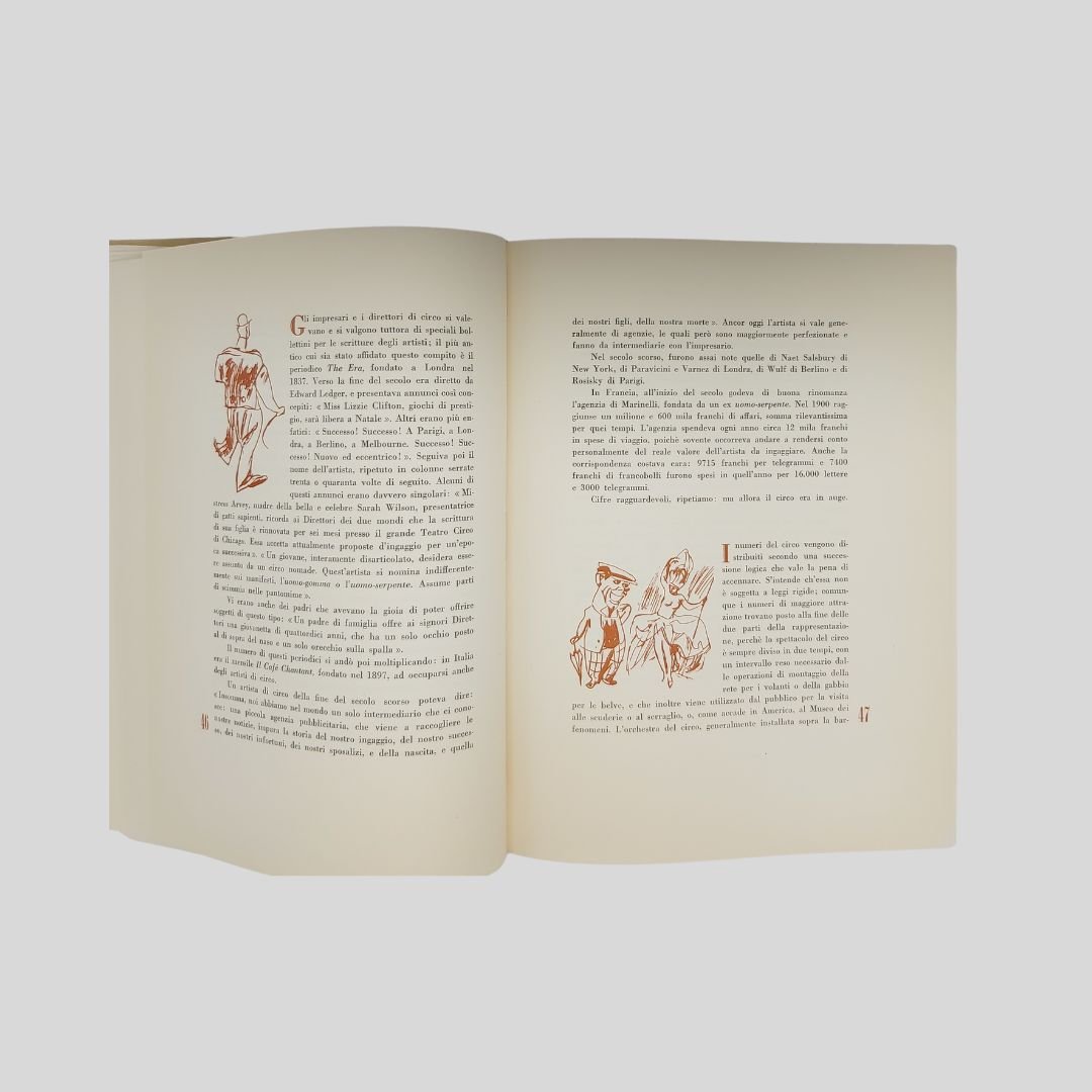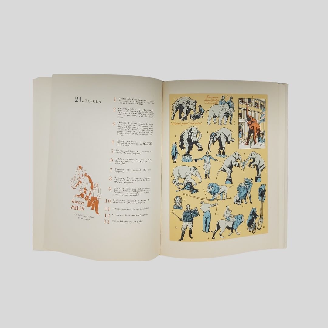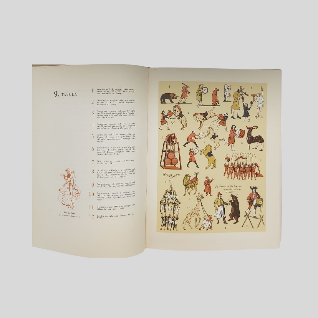 In-4° picc. (cm 28,5), pp. 589. Elegante edizione con numer. vignette in sanguigna interc., 20 tavv. in tinta f.t. che documentano scene della vita del circo e 24 tavv. a colori f.t. contenenti oltre 300 illustrazioni (sistemi e metodi di esecuzione di spettacoli e di singoli numeri). Legatura editoriale in tutta tela, tit. in rosso al dorso e ai piatti, impressioni in oro ai piatti. Sopracoperta. In ottimo stato di conservazione. Come nuovo. Importante monografia sul mondo del circo riccamente illustrata: il circo equestre, le cavallerizze, i circhi italiani, russi, americani, francesi, etc., Barnum, Buffalo Bill, il Circo Molier, gli acrobati, i giocolieri, i contorsionisti, equilibristi e funamboli, i clowns, i grandi domatori, gli animali nel circo, il circo nell’arte… Ogni capitolo con una propria bibliografia. Indici in fine.