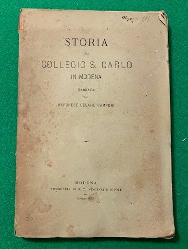 In 4°; (4), 238, (2) pp. Brossura editoriale con titolo impresso al piatto anteriore in nero. Al margine basso del frontespizio, antico timbretto ex-libris privato di noto avvocato. Qualche lieve segno del tempo, qualche brunitura, qualche piccola mancanza al dorso e nel complesso esemplare in buone condizioni di conservazione. Prima edizione di questa nota monografia dedicata alla storia del Collegio S. Carlo di Modena.