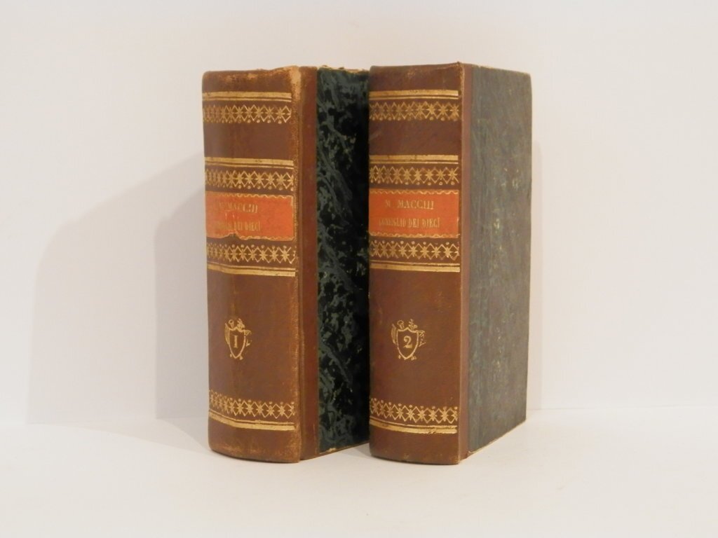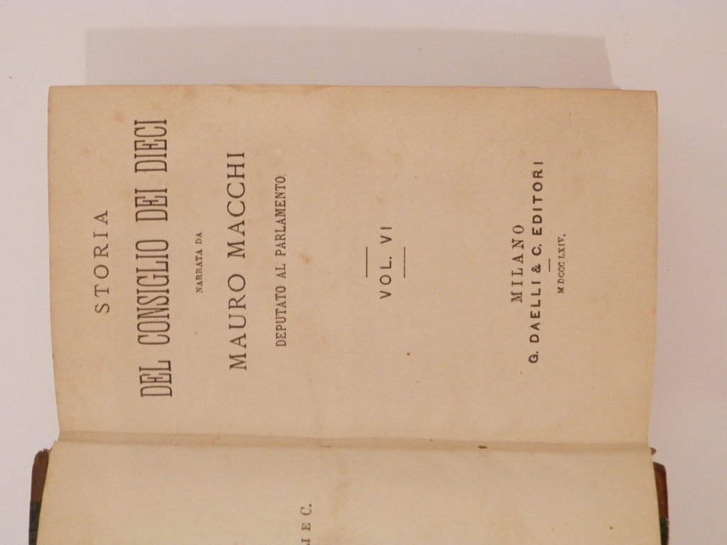 In-12°, mm 155x90, nove volumi due tomi di pp. 187; 167; 165; 156; 171; 158; 224; 149; 123. Legature in mezza pelle con fregi e titoli in oro al dorso. Timbro all'occhietto: Eugenio Treves, Milano, Premio Universo Pittoresco, 1869. Volumi molto ben conservati di questa storia della Repubblica di Venezia dalle origini fino al trattato di Campoformio, più volte ristampata nel XIX secolo. Opera maggiore del politico e giornalista milanese Mauro Macchi, allievo del Cattaneo nonchè redattore del Politecnico. L'autore larga parte della sua vita il accompagnò l'impegno politico e giornalistico a un'intensa attività pubblicistica nel campo storico. Questo testo fu pubblicato la prima volta a Torino nel 1847-49.. *** TUTTI I NOSTRI LIBRI SONO VISIBILI PREVIO CONTATTO MAIL O TELEFONO NELLA NUOVA SEDE DI MILANO: LIBRERIA COSMOPOLIS, VIA JOMMELLI, 22. ***