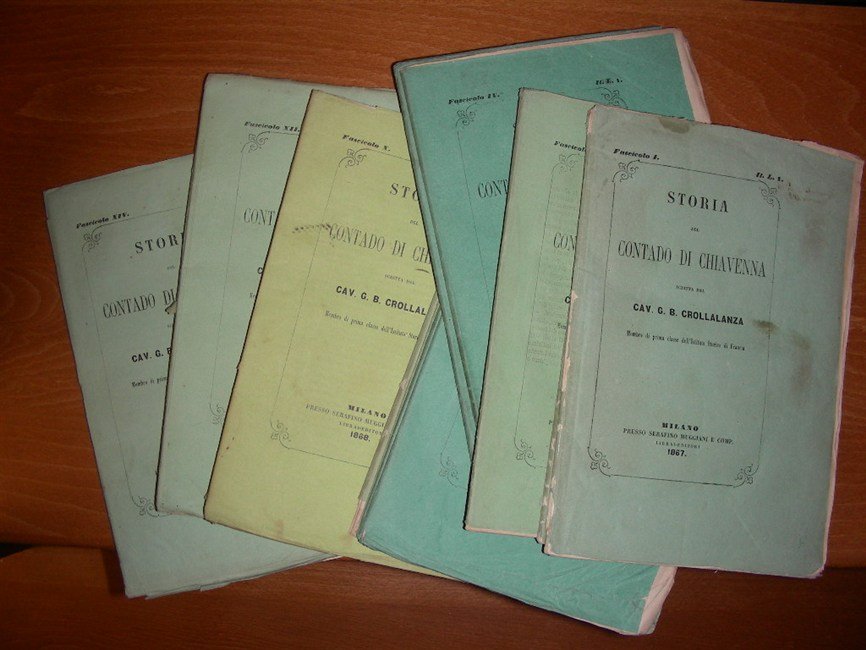 in-8 gr., pp. IX, 676, bross. edit. Ediz. orig. di rara opera su Chiavenna in 14 fasc. mai rileg. nella loro originale veste edit. Crollalanza fu celebre storico marchigiano (Fermo 1819 - Pisa 1892) fondatore dell' "Annuario della Nobiltà Italiana" e autore di numerose opere a carattere araldico e genealogico. Questa sua opera principale - Storia del Contado di Chiavenna - uscì in fascicoli in diversi anni dal 1867 al 1870 e rimane ancora oggi la più valida fonte storica sulla valle lombarda, frutto di ricerche sul campo su iscrizioni, epigrafi, archivi pubblici e privati come si evince dal carteggio Crollalanza conservato alla Biblioteca comunale di Como. Lozzi 1218. [491]