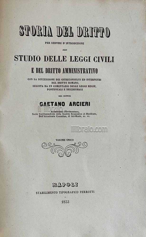 in 8°; pp. 448; leg. in mezza pelle con nervi e titolo in oro impresso al dorso. Arcieri fu membro dell'Accademia Florimontana, dell'Accademia Cosentina e di Aci-Reale, delle Società Economiche della Basilicata e di Principato Ultra. Aderì al movimento Carbonaro prima e poi al movimento liberale. Resse il Comune di Latronico nel 1843. Coinvolto nei moti rivoluzionari del 1848 fu incluso tra gli attendibili politici. Partecipò anche a quelli del 1860. L'autore fu posto tra i maggiori storici di diritto del suo tempo con la pubblicazione in 6 volumi della raccolta delle sue lezioni ("Studj legali ovvero istituzioni di dritto civile moderno") tenute nella scuola di Giurisprudenza di Latronico.