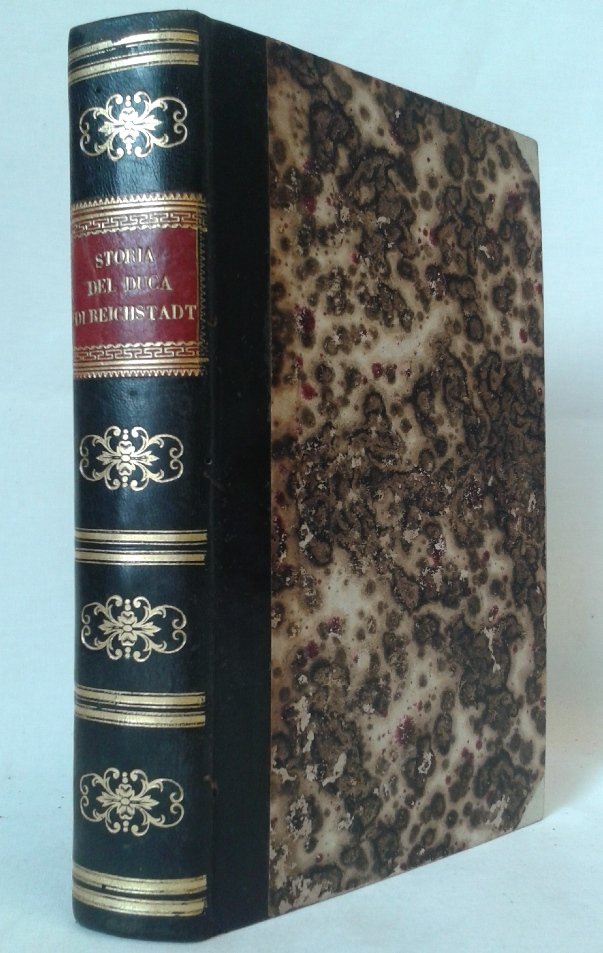 Volume in 8 legato in mezza pelle, titolo al tassello al dorso ornato, tagli colorati, sguardie (exlibris e timbri), occhiello (timbro di antica biblioteca), ritratto del'Aiglon all'antiporta protetto da velina, frontespizio, 484 pp., tre facsimili ripiegati al fondo. La vita e la prematura morte del Duca di Reichstadt, figlio di Napoleone Bonaparte, colui che doveva volare nei cieli della Storia e che una cinica ragion di stato volle rinchiuso in una dorata quanto soffocante corte. L'accidia e gli eccessi segnarono la breve e languida (non per sua colpa) vita dell'Aiglon, assopendo e soffocando quello spirito che fece di suo Padre uno dei grandi di tutti i tempi. In ottimo stato.