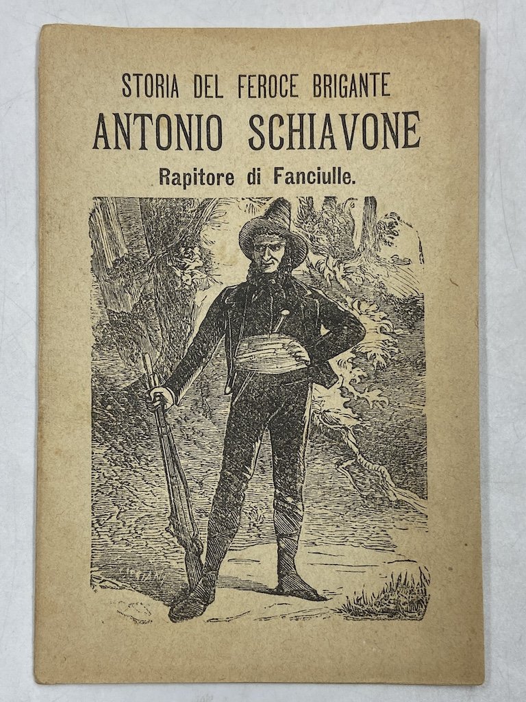 Spillato con copertina illustrata, cm 14x0, pp (22). Poemetto in 38 ottave dedicate al brigante pugliese Antonio Schiavone, nato a Casamassima (Bari) nel 1830 e ucciso ad Acquaviva delle Fonti nel 1870. Questi versi anonimi dedicati al “feroce e sanguinario malvivente che diede il suo contributo, dopo il 1860, alla causa papale” (Morelli) furono oggetto di alcune ristampe da parte dell’editore Salani tra il 1891 e il 1905. Vedi Morelli, BIBLIOGRAFIA DEI POEMETTI E CANTI POPOLARI SUI BRIGANTI, numero 104. Sul piato posteriore elenco dei romanzi di Carolina Invernizio pubblicati da Salani.