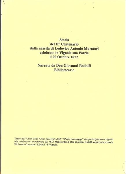 STORIA DEL II CENTENARIO DELLA NASCITA DI LODOVICO ANTONIO MURATORI CELEBRATO IN VIGNOLA SUA PATRIA IL 20 OTTOBRE 1872. NARRATA DA DON GIOVANNI RODOLFI BIBLIOTECARIO