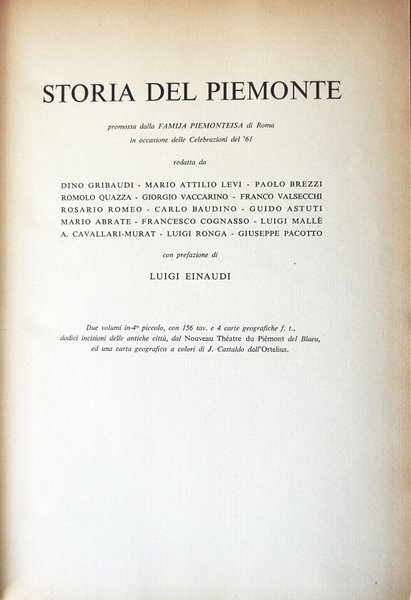 Storia del Piemonte - Promosso dalla famija piemonteisa di Roma in occasione delle celebrazioni del '61 redatta da D.Gribaudi, M.A.Levi, P.Brezzi, R.Quazza, G.Vaccarino, F.Valsecchi ecc. ecc. con prefazione di Luigi Einaudi.