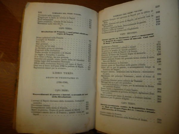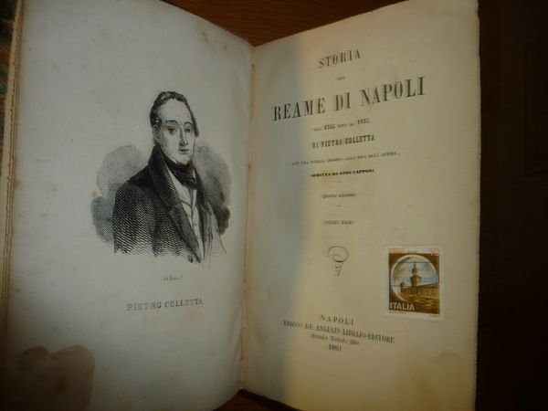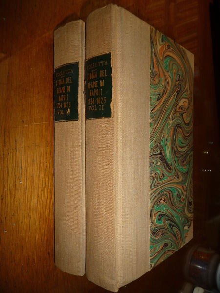 TITOLO: STORIA DEL REAME DI NAPOLI DAL 1734 AL 1825 DI PIETRO COLLETTA CON UNA NOTIZIA INTORNO ALLA VITA DELL'AUTORE SCRITTA DA GINO CAPPONI 2 Voll. DESCRIZIONE: Errico De Angelis Ed. Napoli 1861 IV^ Ed., rilegatura mz. tela tit. al tassello al dorso pp. (XVIII) 414+414, in 16°. Colletta fu uno storico e un generale (Napoli 1775 - Firenze 1831); ufficiale del genio, partecipò alla campagna del 1798 contro i Francesi, ma nel 1799 fu per la repubblica. Nel decennio francese fu giudice di famose cause politiche. Edizione del 1861 della celebre opera storiografica del Regno di Napoli dal 1734 al 1825 scritta da Pietro Colletta (1775-1831) scrittore patriota e storico di Napoli. Colletta partecipò ai moti carbonari del 1820-21. In seguito venne arrestato e poi esiliato a Firenze. Introduzione e vita del Colletta a cura di Gino Capponi (1792-1876) patriota fiorentino, storico e studioso di pedagogia. Indice completo in foto. CONDIZIONI: Buone. Vol. che presenta ex-libris a francobollo con timbro e macchia sulla litografia del Colletta al primo vol. come da foto, una delle ultime quartine è allentata. PESO / WEIGHT: 788 gr. without package