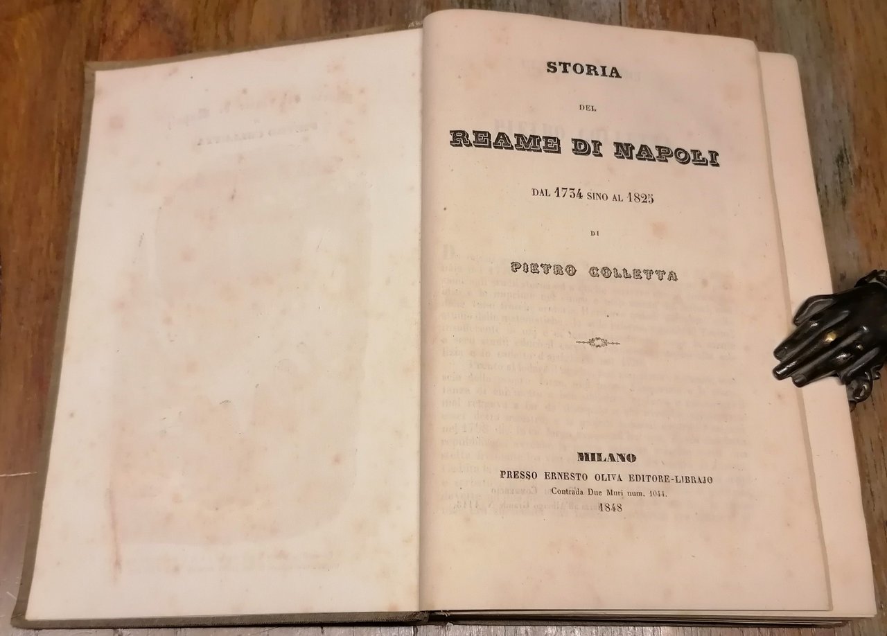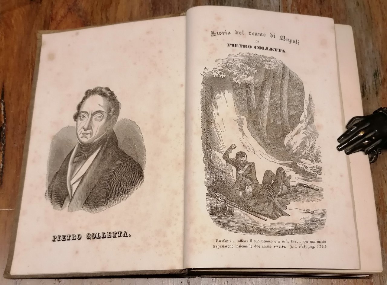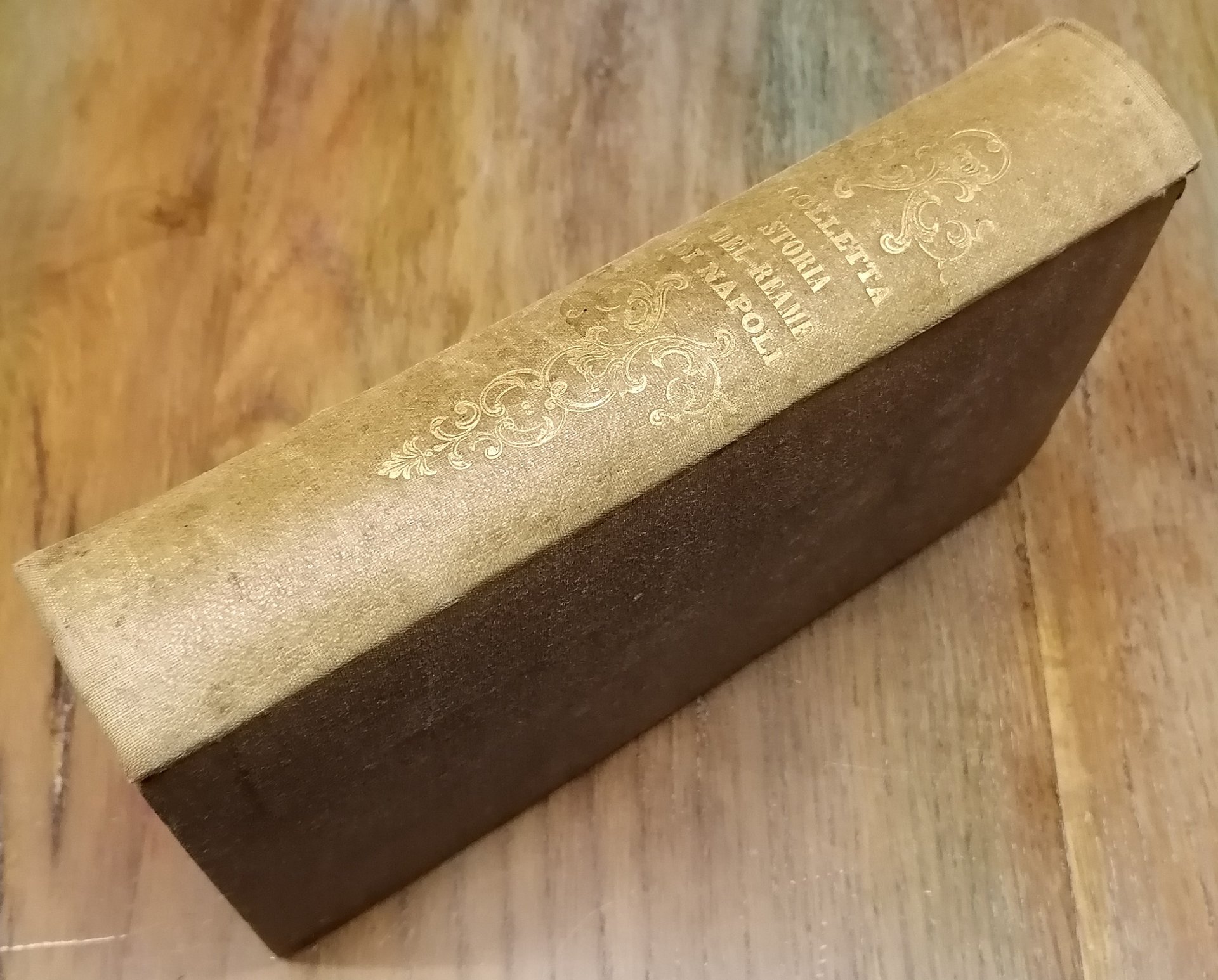 (Regno di Napoli - Borboni - Repubblica partenopea - Murat - Risorgimento italiano) In 8°, legatura coeva in piena percallina marrone chiaro, titolo e ricchi fregi in oro al dorso, ritratto dell'Autore in antiporta, frontespizio figurato in xilografia, frontespizio a stampa, pp. 708. Volume solido con segni del tempo alla legatura, qualche rara e leggera fioritura, lievi bruniture dovute alla qualità della carta, nel complesso ben conservato.