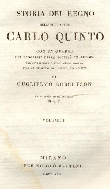 STORIA DEL REGNO DELL'IMPERATORE CARLO V. Con un quadro dei progressi della società in Europa dal sovvertimento dell'Impero Romano fino al principio del secolo decimosesto.