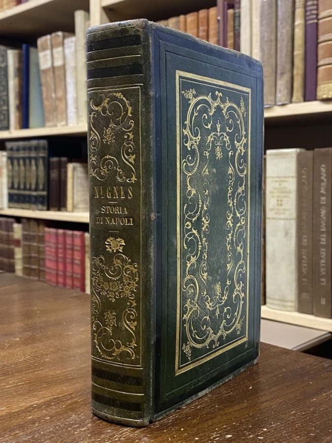 2 volumi (di 6) in 1 in-8° (cm. 20,7), legatura coeva in piena pelle verde decorata con fregi romantici in oro, dorso liscio con titolo in oro tra fregi e filetti in oro e altri impressi a secco, piatti inquadrati da una cornice di doppi filetti a secco e una interna in oro con al centro eleganti fregi floreali (lievi abrasioni, minime tracce d'uso), tagli dorati, risguardi in carta decorata; pp. 533-984 a numerazione continua, in ottimo stato (lievi e sporadiche fioriture); con 5 tavole litografiche fuori testo raffiguranti vedute, monumenti, ritratti e scene storiche. Prima e non comune edizione di quest'importante opera storica composta da 6 libri, di cui qui sono presenti il V e il VI. Cfr. Fera-Morlicchio II, 77. Esemplare molto buono. (SF1)