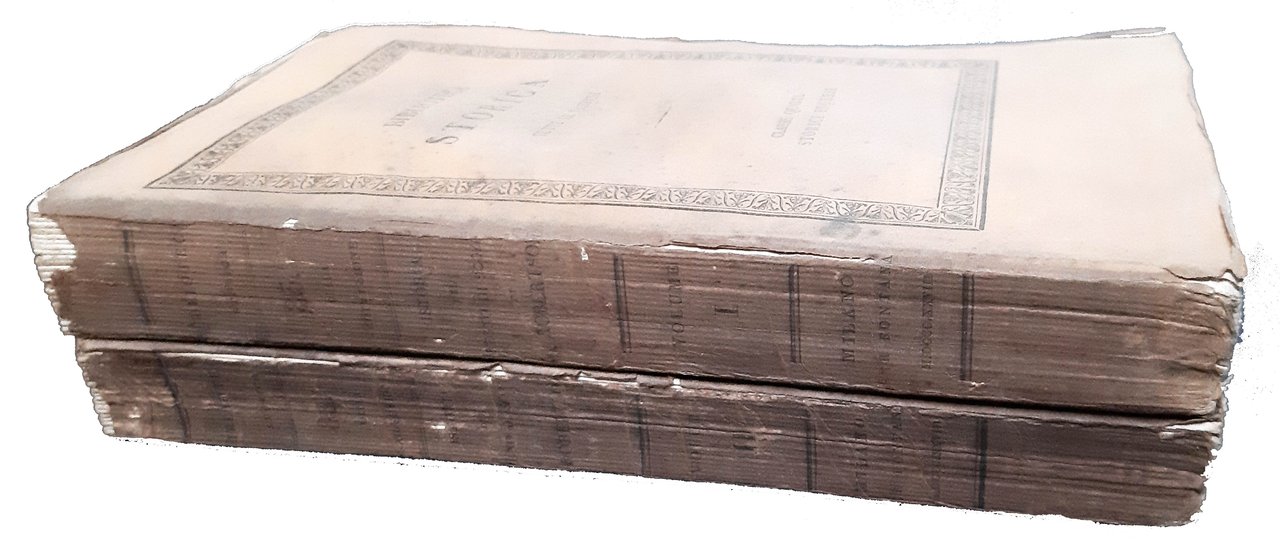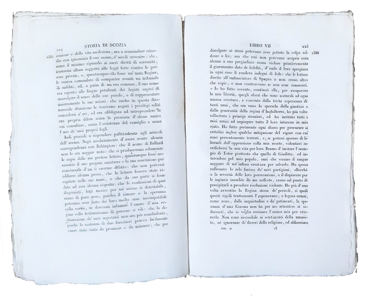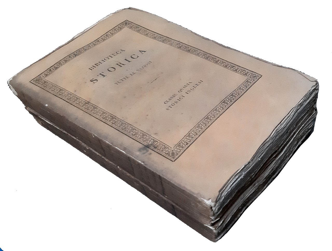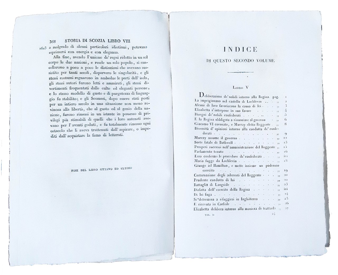 in-4°, 230x146 mm, leg. in brossura editoriale con copertina in carta leggera, fregi e titoli in nero; opera in 2 volumi ; pp. VII, [1], 406, [2]; [4], 378, [2]. Opera appartenente alla collezione "Biblioteca storica di tutte le nazioni. Classe quarta, Storici inglesi". Prima edizione italiana di questa opera storica del Robertson. Robertson, William (1721-1793) è stato uno storico, storiografo e teologo scozzese. Fu ministro nella Chiesa di Scozia, e rettore dell'Università di Edimburgo. "I trenta anni in cui ha presieduto l'Università rappresentano forse l'apice della sua storia." Ha dato un contributo significativo alla scrittura della storia scozzese e alla storia della Spagna e dell'America meridionale. Prov.: Antichi timbri tondi a inchiostro blu al verso del frontespizio (Luigi Gagnoli - Censore - Stati Estensi; Luigi Gattamelata - Censore - Diocesi di Reggio). Rif.: IT\ICCU\UBOE\021440. OCLC, 875158623. Cond.: Segni d'uso alla legatura (alcune mancanze alle cuffie, pieghe, forti bruniture al dorso, macchie). Carte in barbe, con occasionali fioriture. Opera in condizioni generali abbastanza buone.