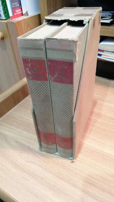 Collana : Contributi alla storia della Civiltà Europea. Vol. 1^ : 177 illustrazioni e 48 tavole di cui 4 a colori. Vol 2^: 226 illustrazioni e 48 tavole di cui 4 a colori. Cofanetto cartonato rigido scolorito e molto danneggiato . Rilegatura in tela. Titolazione e fregi in oro al dorso. Dorsi molto scoloriti. Dorso del vol.2^ danneggiato alla cima. Piatti scoloriti. Tagli superiori bruniti.Tagli laterali puliti. Bruniture sparse all'interno. 628 ( 1^ vol.) + 645 ( 2^ vol. ) Mediocre (Poor) .