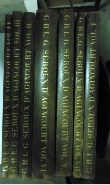 7 voll. in folio, pp. XLVIII + 244 + XXI, 163 con 73 tavv. in fine incise all'acquaforte, 195 + XVI, 87 con 51 tavv. in fine inc. all'acq. [ma 48 secondo la numerazione delle tavole poiche' della 26 esistono anche la 26a, 26b e 26c), 357 + [3] + XXV, 268 con 203 tavv. in fine incise [su 204, manca la no 133], 187 + 3 con un'incisione in fine all'acquaf. n.t. Importante opera completa di tutti e 7 i volumi e mancante di una sola tavola (327 tavole presenti su 328) legato in mz. pl. coeva. Ottimo esemplare (leggera gora marginale alle ultime 13 cc. del III volume), per il resto esemplare freschissimo in ottimo stato di conservazione. Prima edizione italiana (ve ne fu anche una seconda stampata a Prato) di questa monumentale opera di storia dell'arte francese. L'Autore "da' principio con un Prospetto storico dello stato civile, politico e letterario della Grecia e dell'Italia relativamente all'arti belle poco prima della loro decadenza, e nel tempo della medesima sino al loro risorgimento. Presentato per tal guisa il quadro dei tempi comunemente chiamati il medio evo, l'autore entra nel suo assunto, e scorrendo per le tre grandi divisioni tracciate dall'arti sorelle ci offre successivamente la storia dell'Architettura, della Scultura, della Pittura. Ma siccome il suo precipuo scopo era quello di presentarci la storia dell'arte dimostrata co' documenti, cosi' fa egli in certo modo parlare i monumenti stessi e quasi ne commenta il linguaggio (.). Sono oltre a 1400, de' quali piu' di 700 inediti. Essi poi disposti sono in 325 tavole, delle quali appartengono 73 all'Architettura, 48 alla Scultura, 204 alla Pittura. Le incisioni eseguite furono sotto gli occhi stessi dell'autore e colla massima fedelta' onde conservato venisse piu' che fosse possibile il carattere degli originali; cosa importantissima in questo genere di lavori. La maggior parte de' monumenti architettonici vennero intagliati da Domenico Pronti, e da Benedetto Mori allievo del celebre Piranesi; i monumenti della scultura e pittura furono incisi da Tommaso Piroli, uno de' piu' valenti intagliatori romani, e da Giacomo Macchiavelli, che pur fece tutti i disegni con grandissima pazienza e con ugual sapere." (Biblioteca italiana, vol. 45, p. 326 e ss.).
