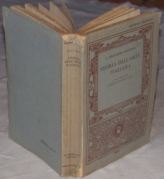 In 8. Dim. 20,5x14 cm. Pp. 574. Edizione del 1933 di questo interessante volume di storia dell'arte italiana scritto da Edoardo Mottini ad uso dei licei. L'opera è in un volume ed è completa. Tra i maggiori argomenti trattati: L'arte paleocristiana, L'arte romanica, Il gotico italiano, L'arte del Rinascimento, L'arte classica, L'arte nel Seicento e nel Settecento, L'arte nell'Ottocento ecc. Brossura editoriale illustrata da Cisari Qualche figura all'interno. In buone condizioni. Copertina editoriale in buone condizioni generali con lievi usure ai margini e dorso. Piatto anteriore in parte staccato. Legatura in buone condizioni. All'interno le pagine si presentano in buone condizioni con rare fioriture. Edition of 1933 of this interesting volume of italian art history written by Edoardo Mottini for the usage of secondary school. The work is in one volume and it is complete. Between the main issues treated: Paleochristian art, Romanic art, Gothic art, Art of the Rinascimento, Classical art, Art during 1600 and 1700, Art during 1800 ecc. Editorial cover illustrated by Cisari. Some figure inside. In good conditions. Editorial cover in good general conditions slightly worn in the edges and spine. Front plate partially detached. Binding in good conditions. Inside pages are in good conditions with occasional foxings.