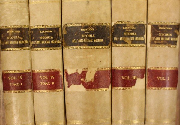 Torino, Tipografia Enrico Schioppo, 1923. In 8¡, opera in 4 voll. I vol. 590 p., contiene le parti: "Rinascenza"-"Epoca delle monarchie assolute", tracce d'umido n.t. II vol. 800 p., contiene le parti: "Monarchie costituzionali e democrazie liberali (secolo XIX), tracce d'umido n.t. III vol. 936 p., contiene la parte: "La rivoluzione francese (1789-1815), tracce d'umido n.t., frontespizio parzialmente strappato, sottolineature a matita colorata n.t. IV vol. Tomo I 611 p., contiene le parti: "La guerra mondiale"-"Campagna del 1914", tracce d'umido n.t., sottolineature a matita colorata n.t. IV vol. Tomo II 591 p., contiene le parti: "La guerra mondiale"-"Fase di logoramento (1915-1918)", tracce d'umido n.t., tabella ripiegata sull'esercito italiano durante la guerra. Legatura artigianale in mezza pergamena con titoli dorati al dorso.
