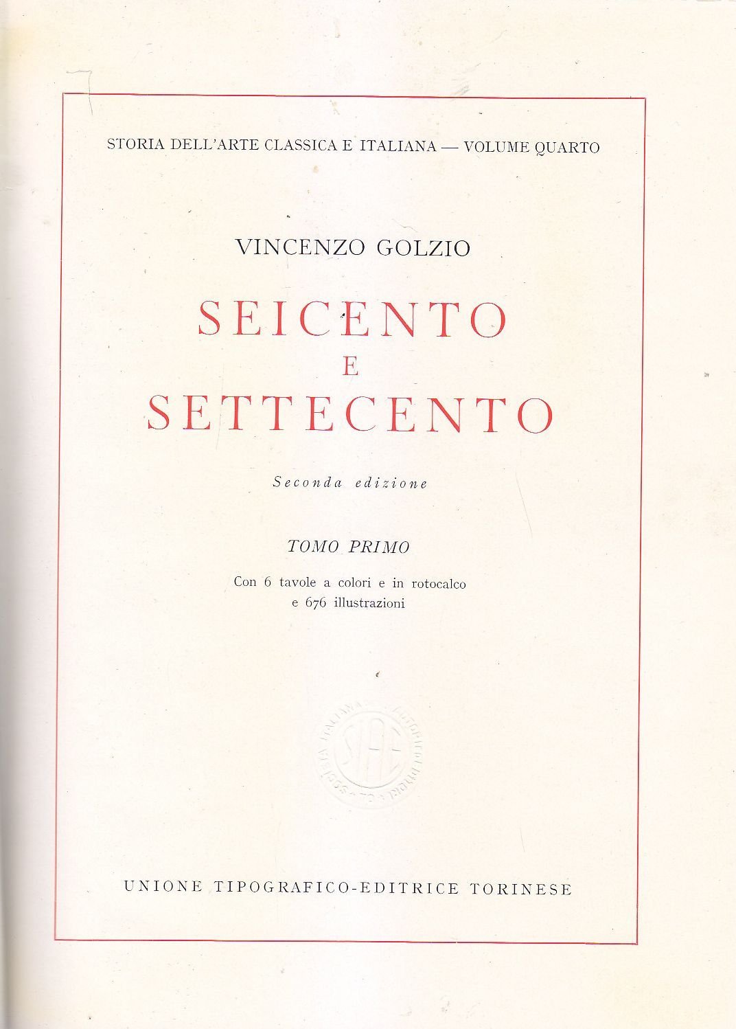 STORIA DELL ARTE SEICENTO E SETTECENTO TOMO I di Vincenzo Golzio. Unione tipografica Editrice Torinese, 1960. XI + 856 pagine, numerose illustrazioni in b/n e colori fuori e nel testo. copertina editoriale in tutta tela illustrata. Stato di conservazione: molto buono (pagine normalmente ingiallite) UNA SOLA COPIA DISPONIBILE! affrettati prima che vada via!