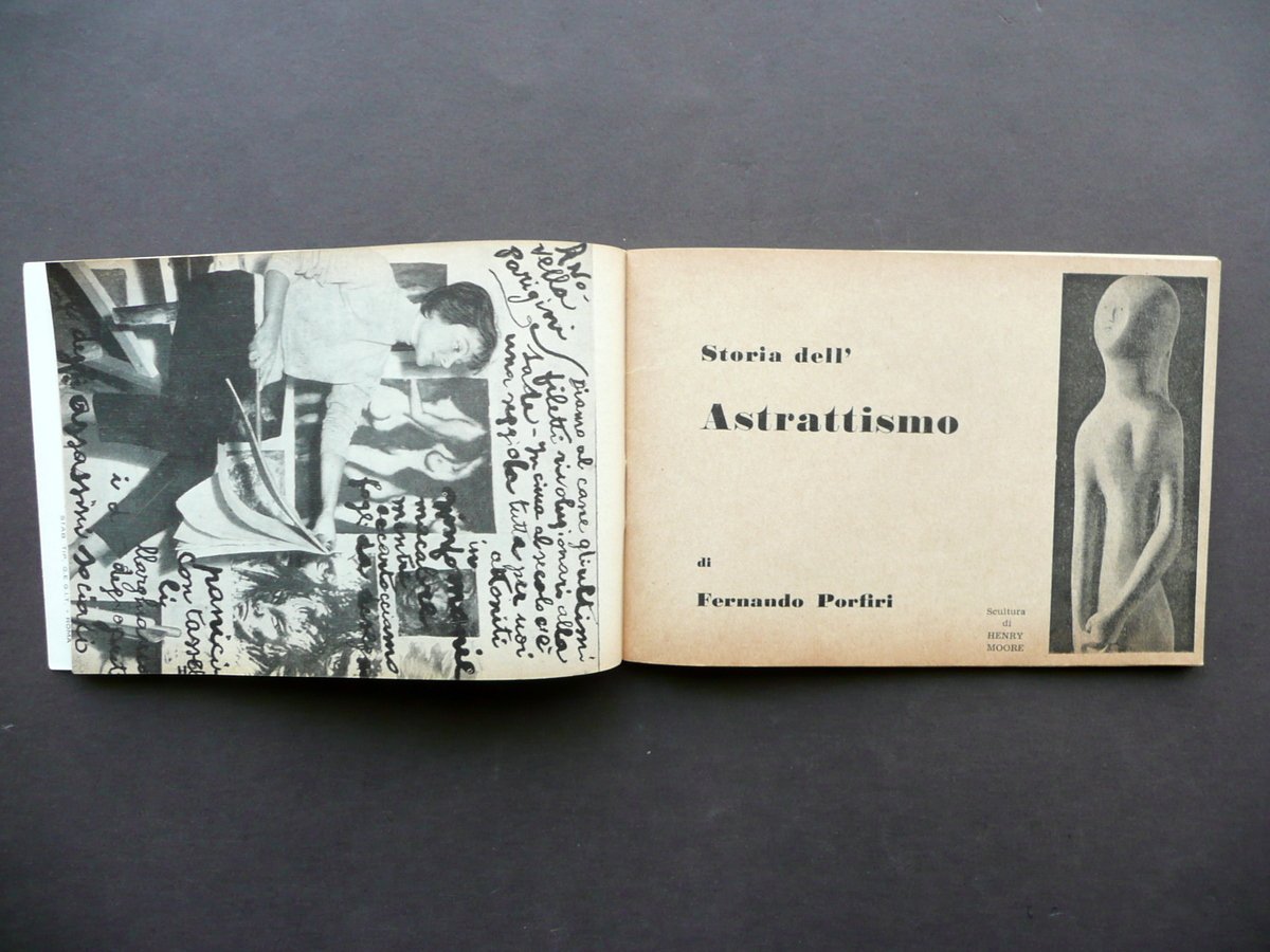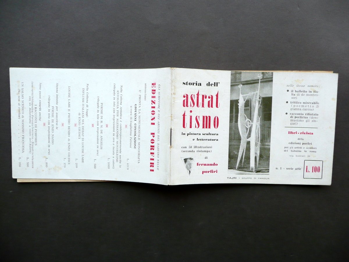 Fernando Porfiri, Storia dell'astrattismo in pittura - scultura - letteratura con 50 illustrazioni (seconda ristampa) Nello stesso numero: Il balletto in Italia" di De Montessori; "Trittico miserabile" (poemetto di Gianna Carcos); "Racconto rifiutato di porfirius (dove muoiono gli zingari)" Edizioni Porfiri (collana "libri - rivista"), Roma, s. d. (anni '50 del Novecento circa); cm 11x16, pp. 72 con 50 ill. in b/n nel t. e a piena pagina; brossura ed. ill. in b/n. Condizioni di conservazione Esemplare ben conservato con tracce d'uso; brossure con qualche piccola lieve brunitura. Interni buoni con lievi accenni d'ingiallimento ai margini, dovuti al tipo di carta. Interessante e "concentrata" rassegna sull'astrattismo, la sua evoluzione e i suoi principali interpreti. Presenza di varie illustrazioni in bianco e nero nel testo e fuori testo (vedi foto). OPEB.3077 N "
