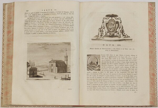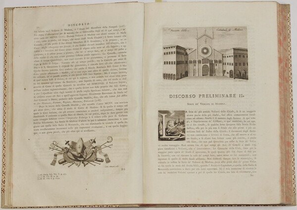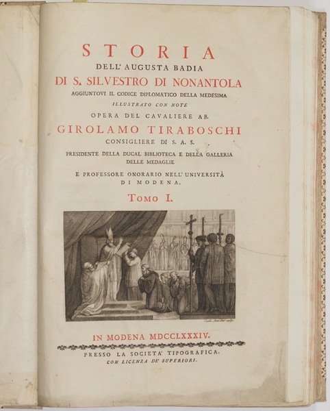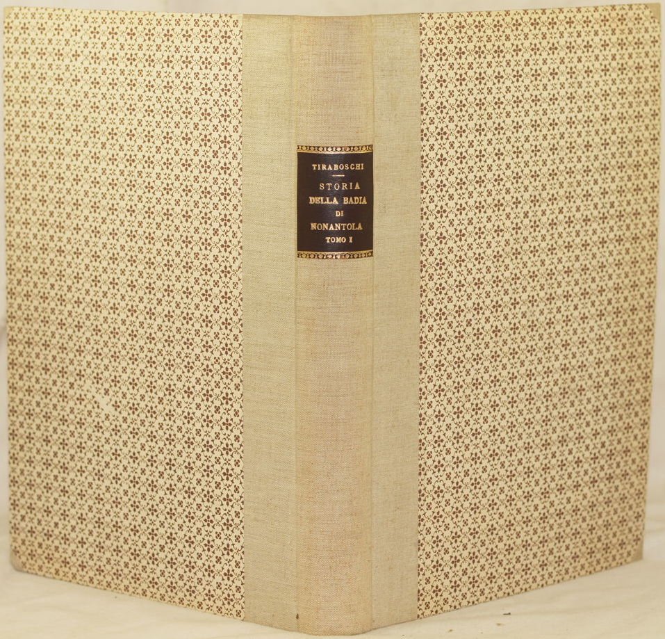 In folio. cm. 38,5x27. Pp. XIX+526+(4). Splendida opera del 1784, la storia della Badia di Nonantola scritta da Girolamo Tiraboschi (1731-1794). L'opera era composta da due tomi, siamo purtroppo in possesso solo del primo tomo contenente tutte le incisioni e pagine ma mancante della carta.<BR>L'opera descrive i beni e le proprietà della Badia includendo quindi i territori di Modena, Bologna, Avellana, Solara, Frignano, Cremona, Pavia, Milano, Mantova, Piacenza, Parma, Ferrara, Valfabbrica nella diocesi di Assisi, Nocera Umbra, Sassoferrato. Una parte dedicata allo stato di Modena a partire dal XII secolo, Vescovi di Modena, storia della Badia di Nonantola dalla sua fondazione fino al presente (tra cui descrizione della biblioteca), Delle chiese e dei beni che il Monastero di Nonantola avea in diverse parti d'Italia. Alla fine del volume lista dei vescovi di Modena, Abati del Monastero di Nonantola, abati, vicari. Il testo è impreziosito da più di 43 finissime incisioni su rame nel testo di Carlo Antonini (1740-1821) che mostrano numerose vedute: Nonantola, palazzo seminario abbaziale, Modena, cattedrale di Modena, San Silvestro di Nonantola, Fanano, Chiesa di San Michele Arcangelo di Nonantola, Bologna, Castelvetro, Chiesa di san Luca di Camurana, Sestola, Crevalcore, Serra Sant Abbondio, Monastero di Fonte Avellana, e alcune scene allegoriche, delle quali una al frontespizio coperta da velina. Antica firma di possesso all'occhietto. In buone condizioni. Copertina in mezza tela novecentesca in ottime condizioni generali con lievi usure ai margini e dorso (vedere foto). Legatura in ottime condizioni. All'interno le pagine si presentano in buone condizioni con rare fioriture. Parte mancante al margine inferiore dell'occhietto ma restaurata. Segni di restauro al margine inferiore e a quello destro fino a pag. V. Piccole parti mancanti al margine destro da pag. 309 a 216 senza perdita di testo. Piccola galleria di tarlo al margine di piegatrura da pag. 519 alla fine senza perdita di testo. Faboulous work of 1784, the history of Badia of Nonantola written by Girolamo Tiraboschi (1731-1794). The work was made up of two tomes, unfortunately we only have the first tome containing all prints and pages but without the map. The author describes the goods belonging to Badia so including the areas of Modena, Bologna, Avellana, Solara, Frignano, Cremona, Pavia, Milano, Mantova, Piacenza, Parma, Ferrara, Valfabbrica nella diocesi di Assisi, Nocera Umbra, Sassoferrato. A part is dedicated to the history of state of Modena from XII century, Byshops of Modena, history of Badia di Nonantola from its establishment until present times (description of library also), Churches and goods Nonantola had in different parts of Italy. The text is enriched of more than 43 very fine copper prints in the text engraved by Carlo Antonini (1740-1821) showing different views: Nonantola, palazzo seminario abbaziale, Modena, cattedrale di Modena, San Silvestro di Nonantola, Fanano, Chiesa di San Michele Arcangelo di Nonantola, Bologna, Castelvetro, Chiesa di san Luca di Camurana, Sestola, Crevalcore, Serra Sant Abbondio, Monastero di Fonte Avellana, and some allegorical scenes, one of them in the title page covered with tissue paper. Ancient signature of the former owner. In good conditions. Half cloth cover of XX century in very good general conditions slightly worn in the edges and spine (see the photo). Binding in very good conditions. Inside pages are in good conditions with occasional foxings. Missing restored part in the first title page. Restauration sign in the lower and right edge until pag. V. Little missing parts in the right edge from pag. 309 until 216 with no loss of text. Little worming in the folding edge from pag. 519 until the end with no loss of text.