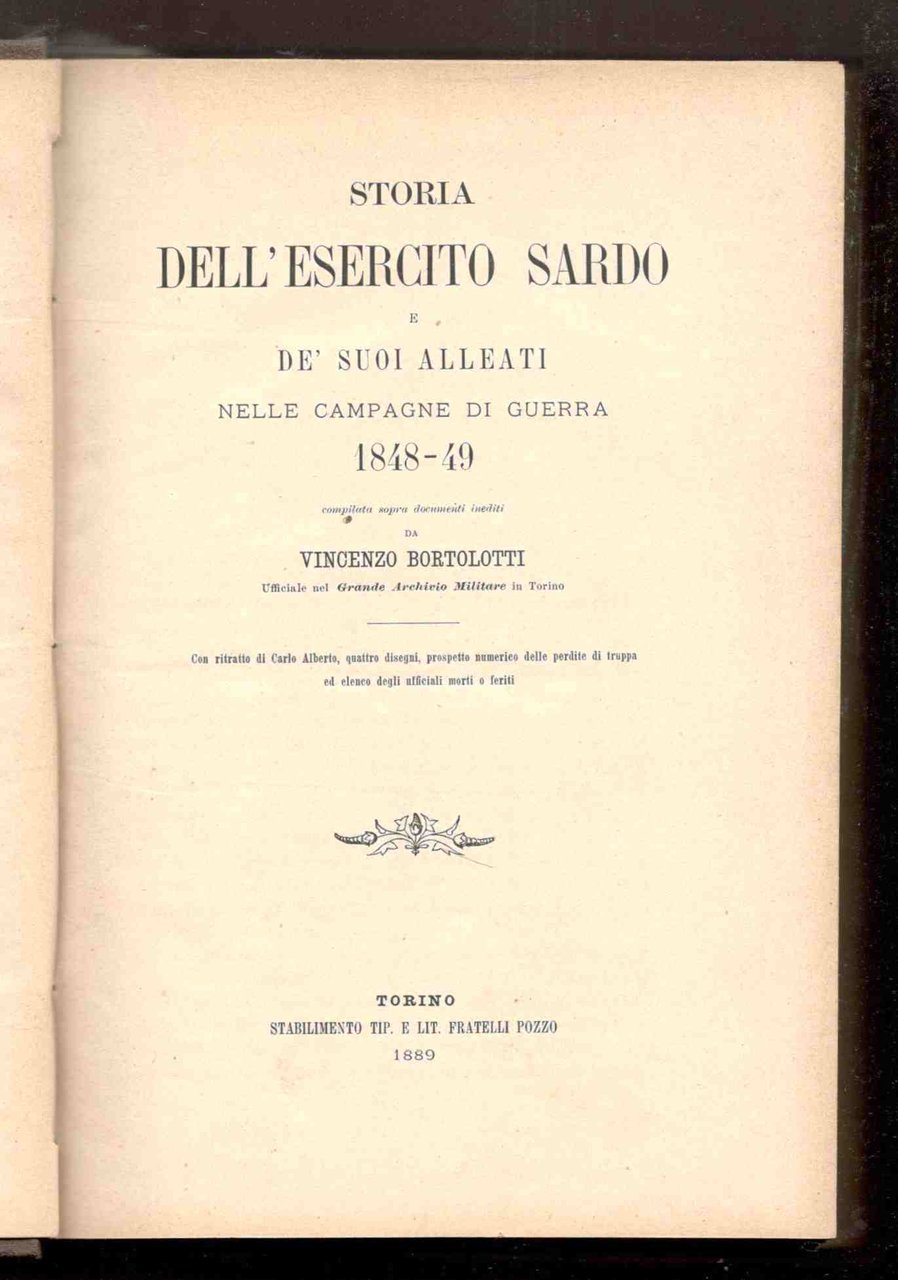 In 8°, pp. 448, (2). Con un ritratto di Carlo Alberto. Tela bruna dell'epoca con titoli oro sul primo piatto e sul dorso. Copia molto buona.