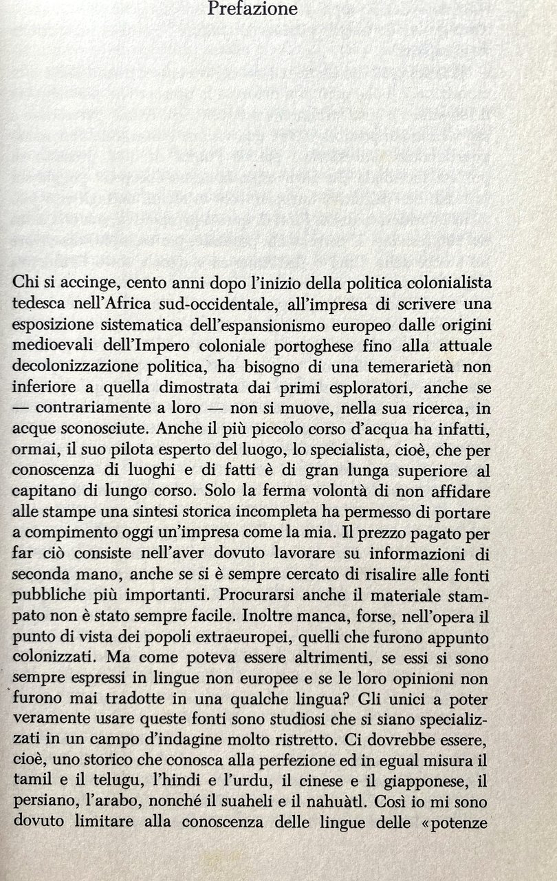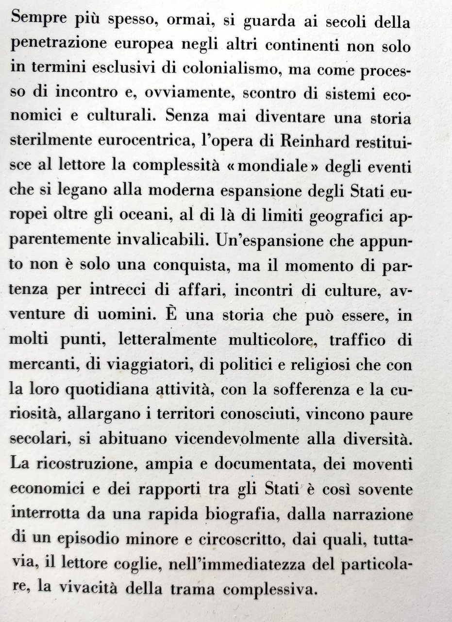 Sempre più spesso, ormai, si guarda ai secoli della penetrazione europea negli altri continenti non solo in termini esclusivi di colonialismo, ma come processo di incontro e, ovviamente, scontro di sistemi economici e culturali. Senza mai diventare una storia sterilmente eurocentrica, l'opera di Reinhard restituisce al lettore la complessità mondiale degli eventi che si legano alla moderna espansione degli Stati europei oltre gli oceani, al di là di limiti geografici apparentemente invalicabili. Un'espansione che appunto non è solo una conquista, ma il momento di partenza per intrecci di affari, incontri di culture, avventure di uomini. È una storia che può essere, in molti punti, letteralmente multicolore, traffico di mercanti, di viaggiatori, di politici e religiosi che con la loro quotidiana attività, con la sofferenza e la curiosità, allargano i territori conosciuti, vincono paure secolari, si abituano vicendevolmente alla diversità. La ricostruzione, ampia e documentata, dei moventi economici e dei rapporti tra gli Stati è cosi sovente interrotta da una rapida biografia, dalla narrazione di un episodio minore e circoscritto, dai quali, tuttavia, il lettore coglie, nell'immediatezza del particolare, la vivacità della trama complessiva.