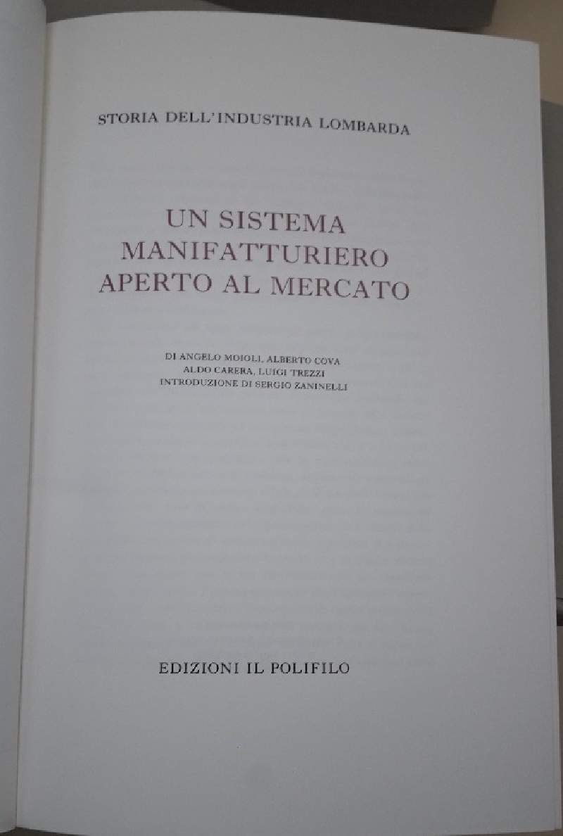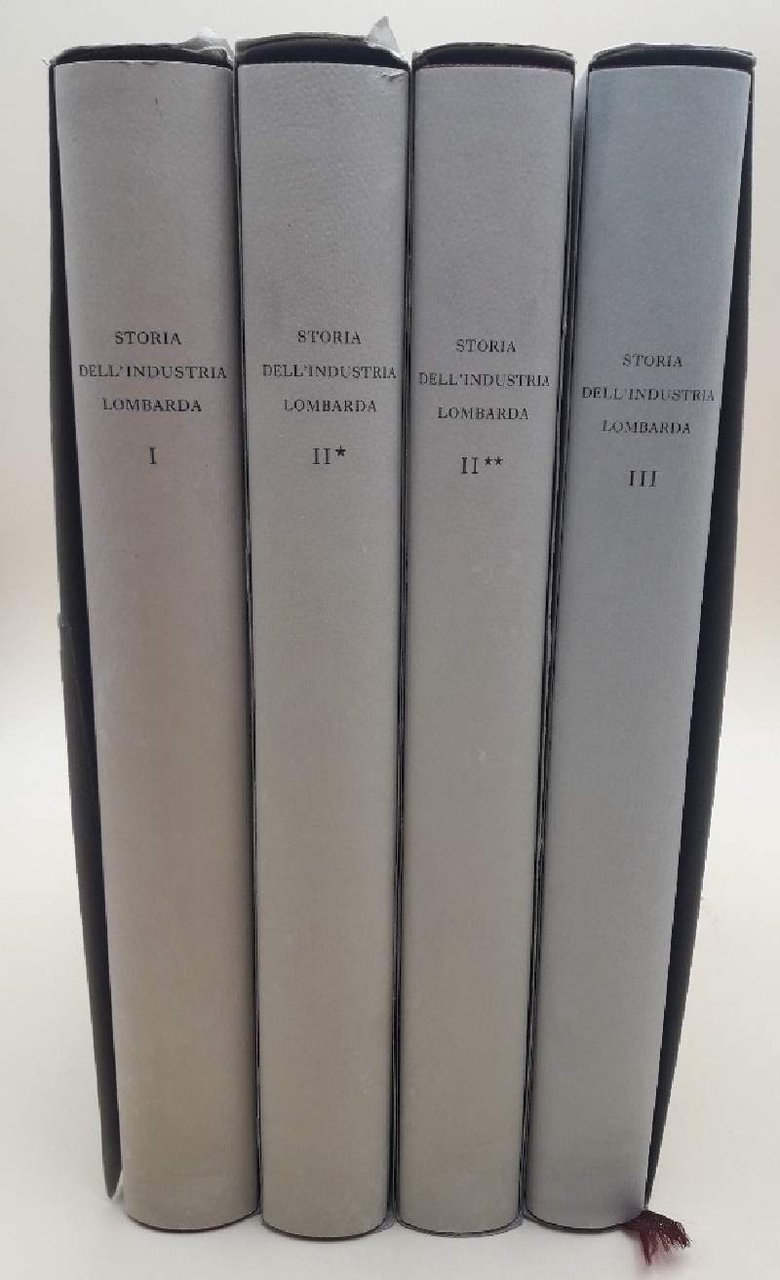 3 voll in 4 tomi, in 8', leg. ed. con sovrac. e astucci in cartoncino muto: vol I- Un sistema manifatturiero aperto al mercato; Moioli, Cova, Trezzi, Carera, introduzione di Sergio Zaninelli, pp. XXI+324, ill. in n. n.t., una col. in antiporta. vol.2- Alla guida della prima industrializzazione italiana-Dall'unita' politica alla fine dell'Ottocento, di Sergio Zaninelli e Pietro Cafaro, pp. XXI+286, ill. e tabelle in n. n.t., una col. in antiporta. vol 2**Alla guida della prima industrializzazione italiana-Dalla fine dell'Ottocento alla Grande Guerra, di Sergio Zaninelli, Pietro Cafaro e Rosalba Canetta, pp. XXIV+269, ill. in n. e col. n.t., una in antiporta. vol. 3- Sviluppo e consolidamento di un economia industriale-Dalla prima alla seconda guerra mondiale, di Sergio Zaninelli, Alberto Cova, Pasquale Galea, e Claudio besana, pp. XXI+298, ill. in n. e col. n.t., una in antiporta. Volumi in perfetto stato, lievi bruniture ai dorsi, minimi segni del tempo agli astucci. ***Due to bureaucratic reasons, books dated over 70 years old cannot be immediately exported, please contact us before placing the order.***