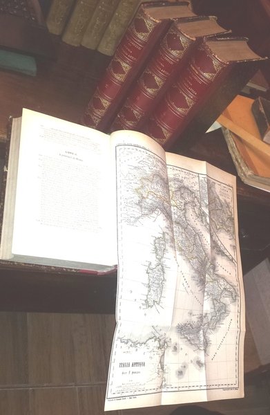 In-4 (23,5 cm) 4 voll. 904 I c. (di tavola geografica ripiegata); 663; 824; 1064. Marca editoriale ai quattro frontespizi con le monete. Occhietto con titolo: "Storia dell'Italia antica". Elegante legatura in mezza pelle rossa con piatti rivestiti di carta marmorizzata, caratteri e fregi dorati al dorso. Carta diversamente decorata ai contropiatti. Al primo volume carta dell'Italia antica.Vannucci Atto (1810-1883): storico, filologo e sacerdote nato a Tobbiana (PT) nel 1810, morto a Firenze il 9.VI.1883. Nel 1847 diresse “L’Alba” e partecipò al '48 con iniziative di propaganda patriottica. Dal 1859 fu direttore della Biblioteca Magliabechiana di Firenze e nel 1865 fu nominato senatore del regno.