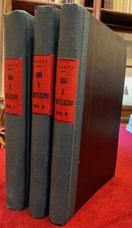 8vo (cm. 22,8), 3 Voll.; 3 cc.nn. (compresa antiporta figurata e frontespizio con graziosa vignetta xilografica), XIII(1) pp., 1 c.nn., 428 pp.; 3 cc.nn. (compresa antiporta e frontespizio), 322 pp.; 3 cc.nn. (compresa antiporta e frontespizio), 384 pp. Con alcune illustrazioni n.t. e complessive 19 tavv. f.t. Legature ‘900 in mz. tela verde con titolo a stampa su tassello al ds. Esemplare in ottimo stato di conservazione. Edizione originale. Cfr. Lozzi (n. 2900, in nota): ‘Opera pregevolissima e rara’. Provenienza: Collezione Spina, Avezzano (timbretti ex libris).