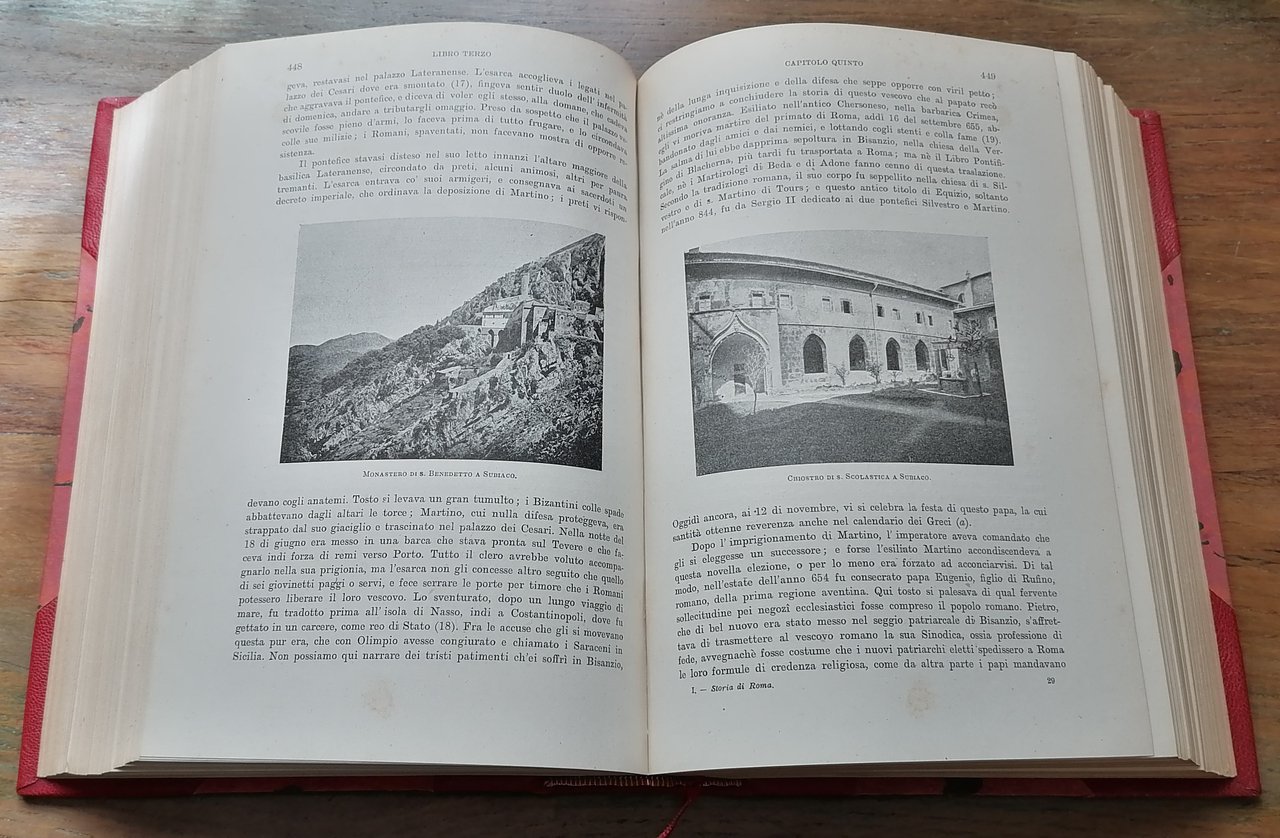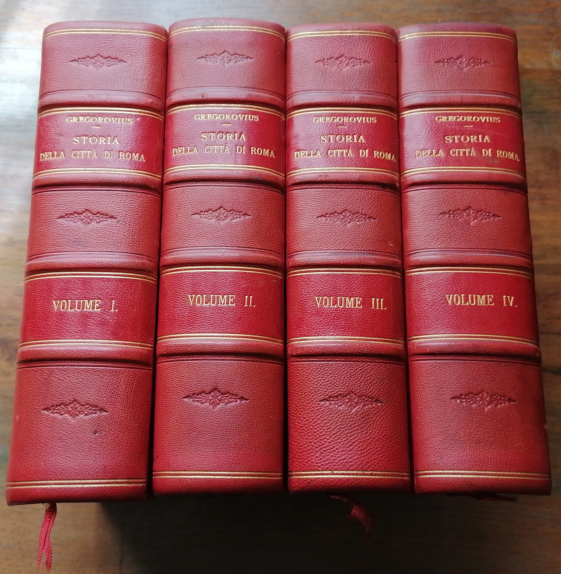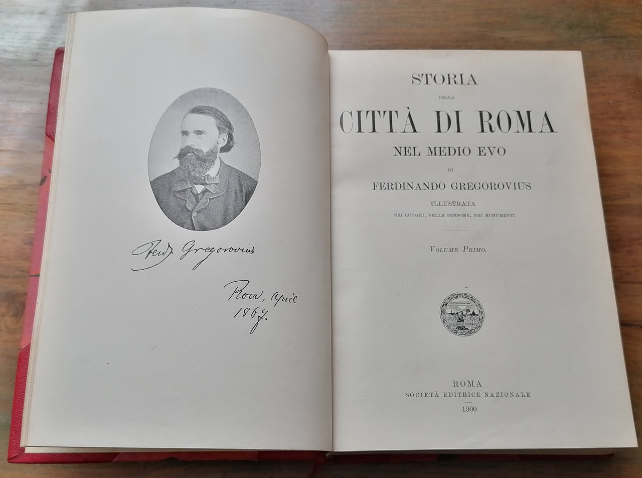 Quattro grossi volumi in 8°, legatura coeva in mezza pelle rossa con punte, dorso a quattro nervi con titoli, filetti impressi in oro e fregi a secco, carta marmorizzata ai piatti, nastrino segnalibro in tessuto rosso, pp. XXI,(3),923,(5) ; (8),923,(1) ; (8),895,(1) ; (8),1000, con numerose illustrazioni in bianco e nero nel testo (luoghi memorandi, medaglie e monete rare, monumenti e persone celebri nella storia di Roma e d'Italia) ricavate, per la maggior parte, da documenti fotografici appositamente eseguiti per questa edizione. Traduzione di Renato Manzato, con note aggiuntive di Luigi Borsari. Un'etichetta coeva di legatoria artistica di Genova ai risguardi anteriori. Ex libris privato al recto dei fogli di guardia anteriori. Alcune tracce di ossidazione ai tagli di testa, un piccolo restauro al margine bianco di piede delle 30 carte finali nel volume secondo, per altro ottimo stato di conservazione.