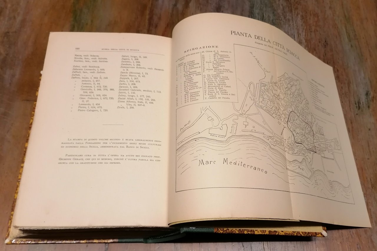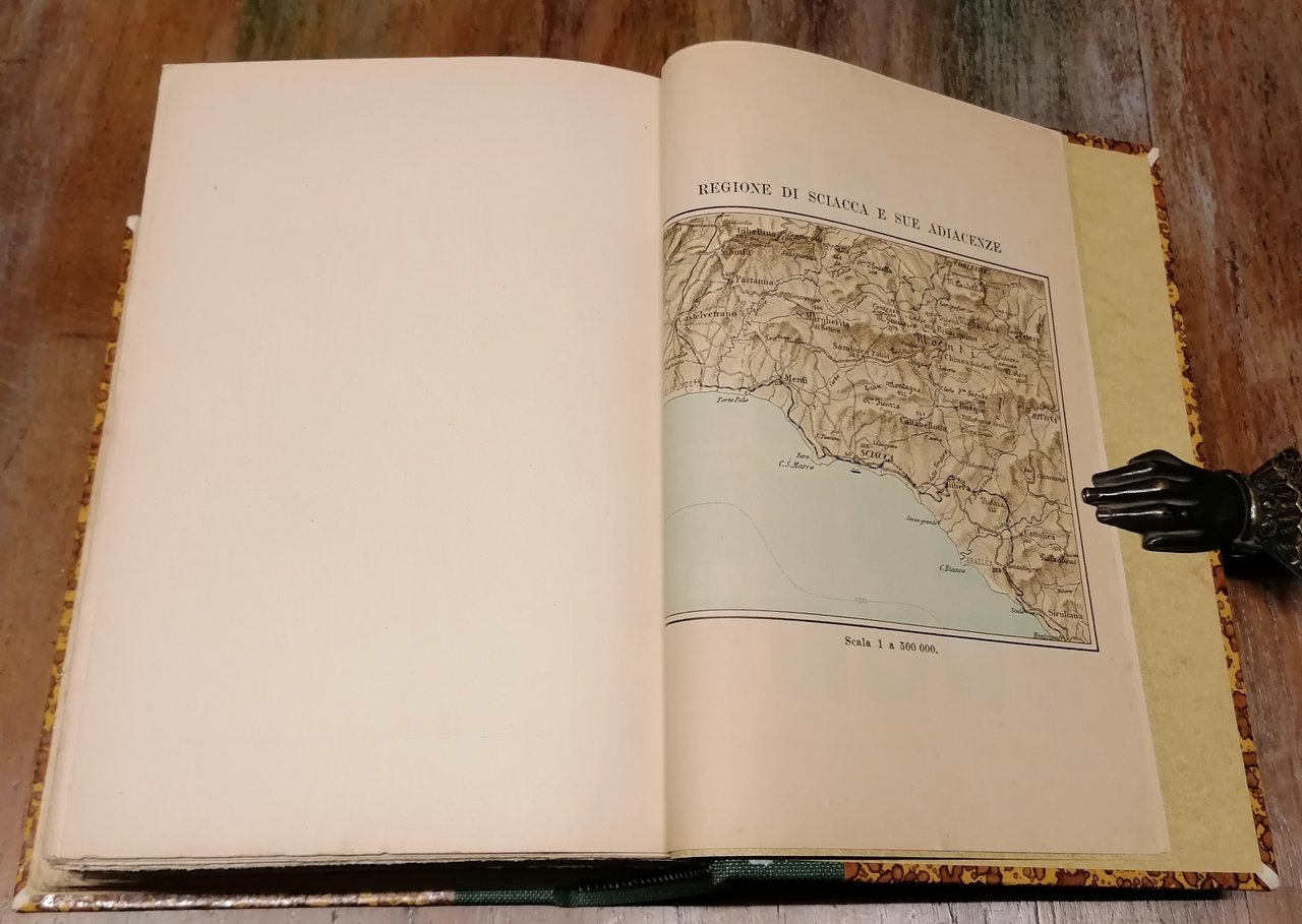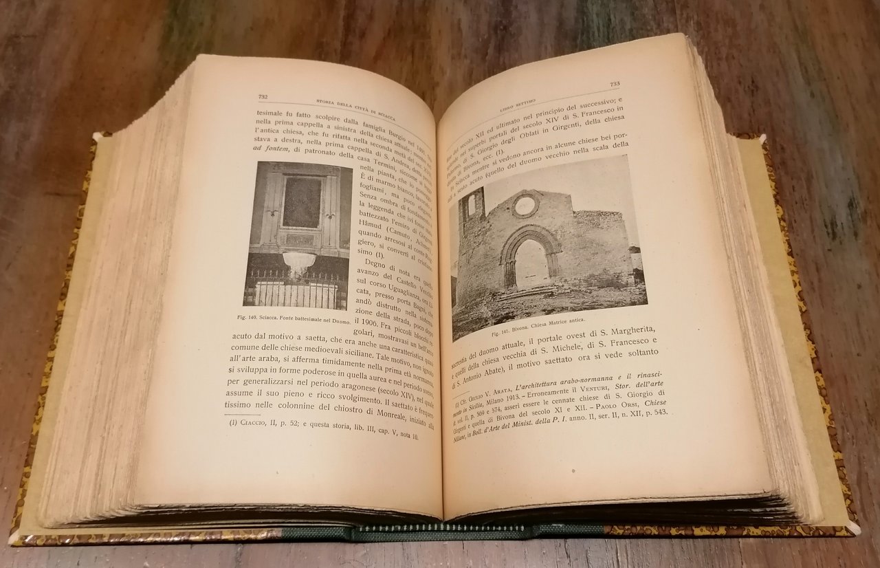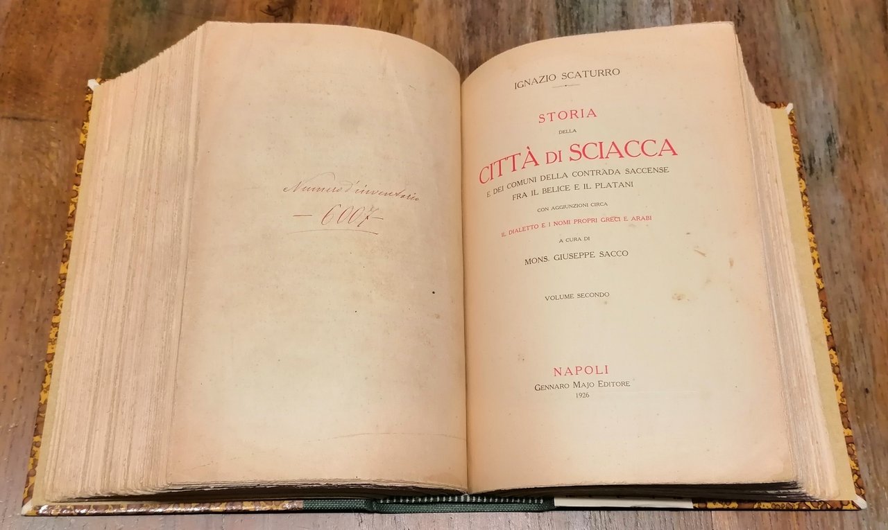 (Storia locale; Sicilia; Agrigento; Dialetti siciliani) Due volumi riuniti in un tomo in 8°, legatura non coeva in mezza tela verde, al dorso tassello in pelle rossa con titoli in oro, carta marmorizzata ai piatti, pp. IX,(5),761 ; 688, con tre tavole fuori testo. Ottimo stato di conservazione. Edizione originale. Studio sulla Città di Sciacca e sui paesi limitrofi con ampie note bibliografiche.