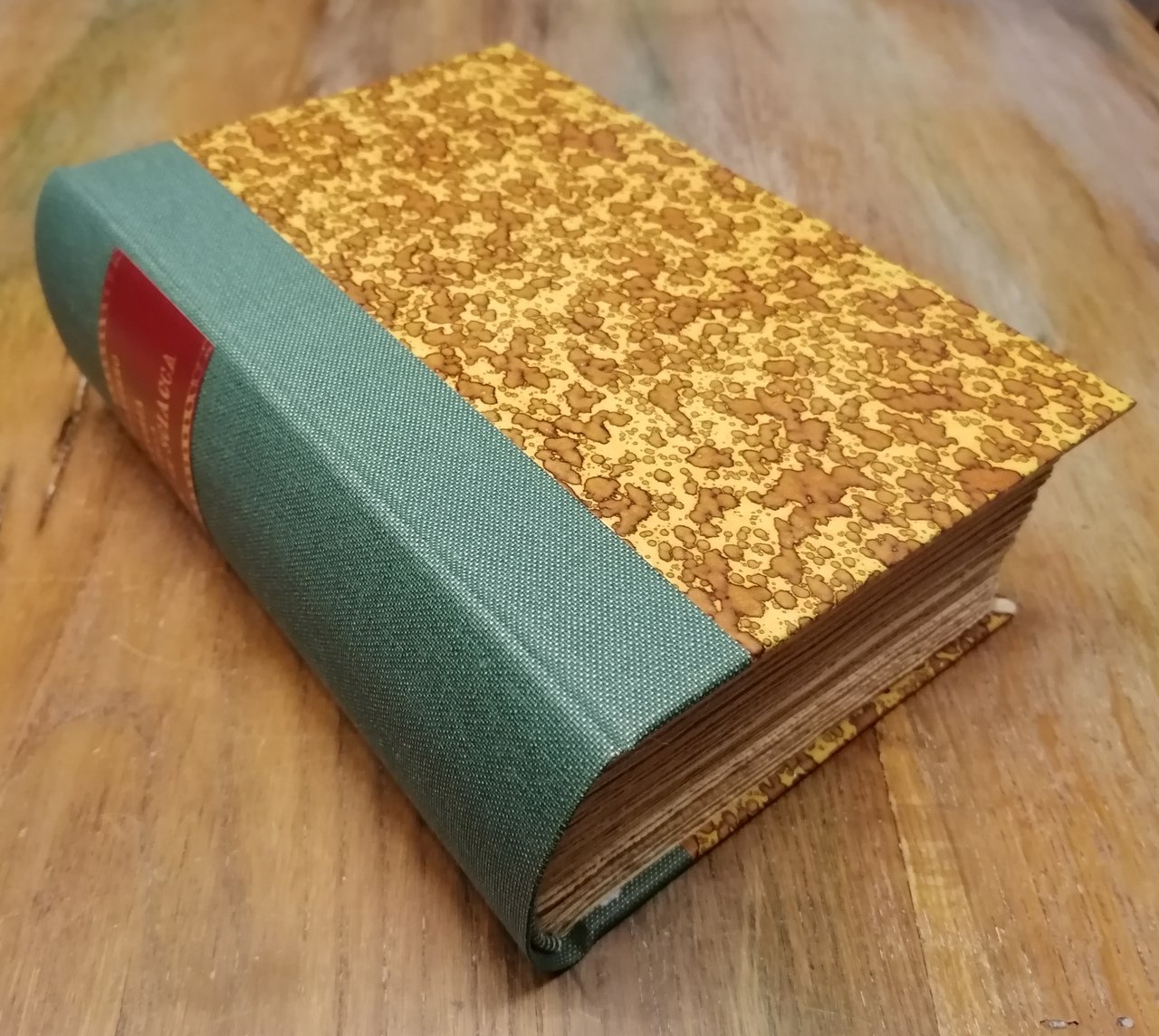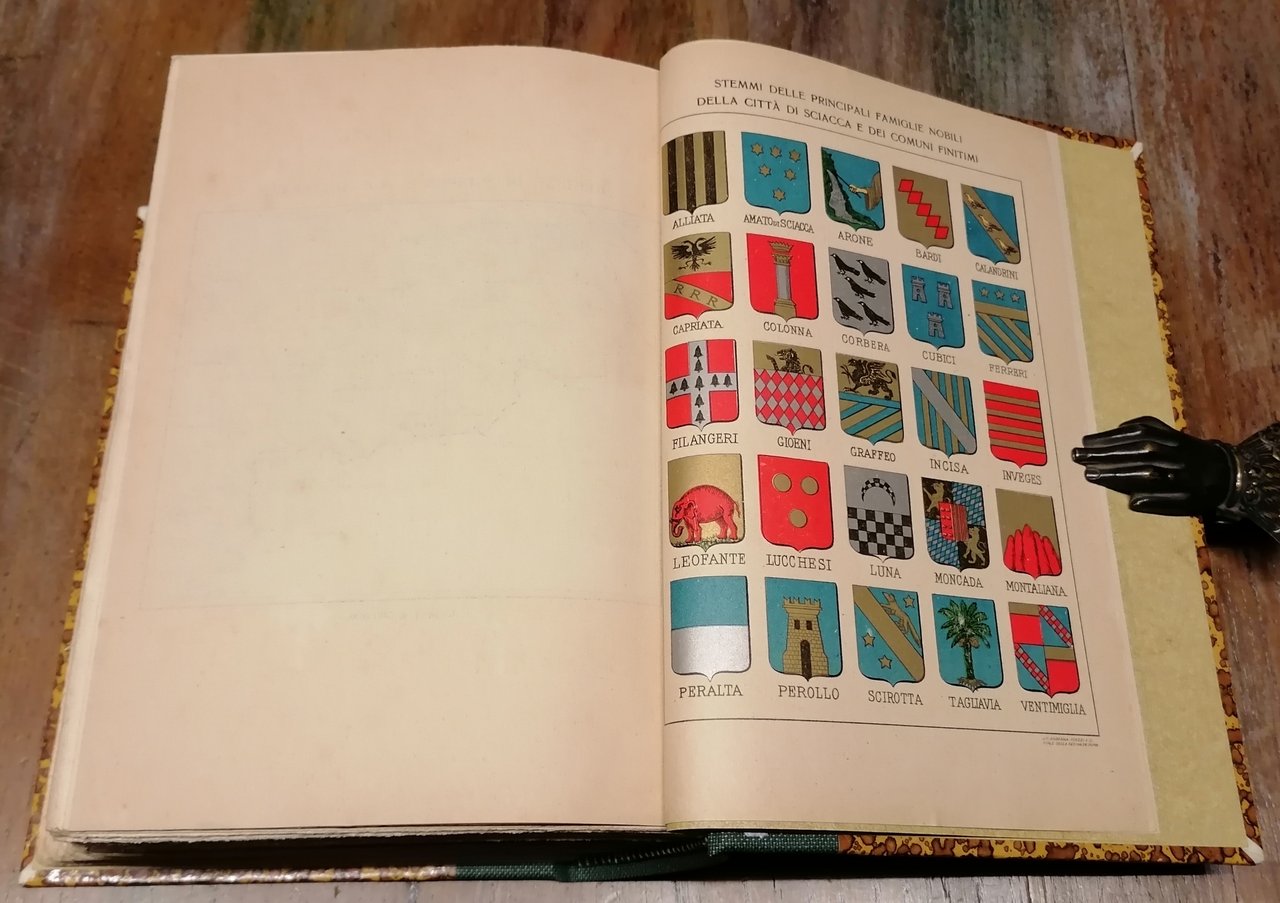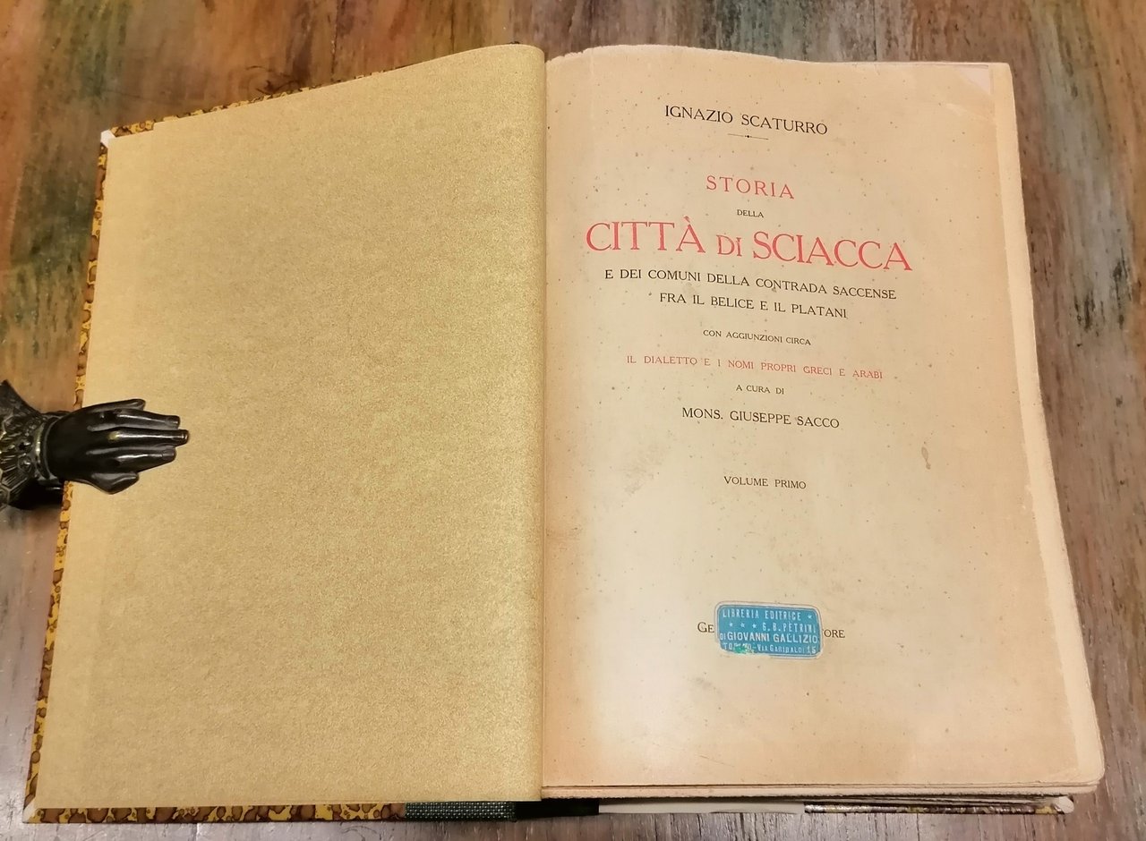 (Storia locale; Sicilia; Agrigento; Dialetti siciliani) Due volumi riuniti in un tomo in 8°, legatura non coeva in mezza tela verde, al dorso tassello in pelle rossa con titoli in oro, carta marmorizzata ai piatti, pp. IX,(5),761 ; 688, con tre tavole fuori testo. Ottimo stato di conservazione. Edizione originale. Studio sulla Città di Sciacca e sui paesi limitrofi con ampie note bibliografiche.